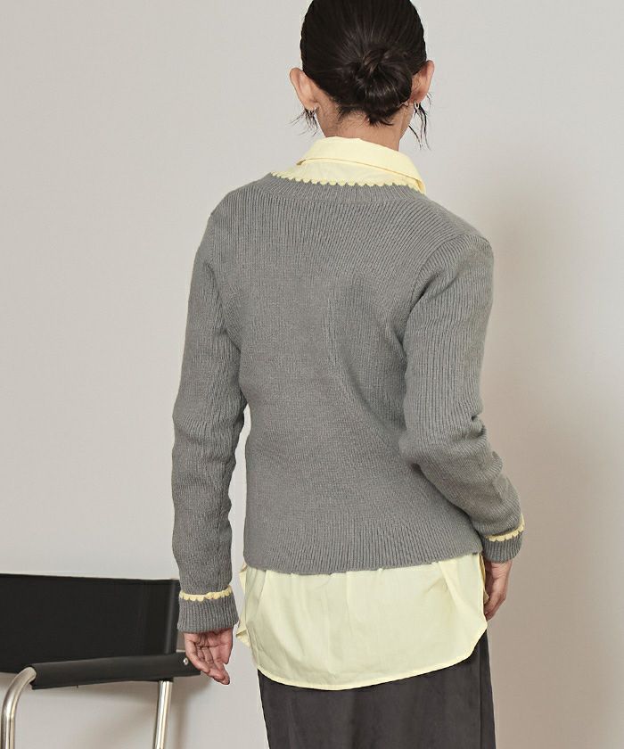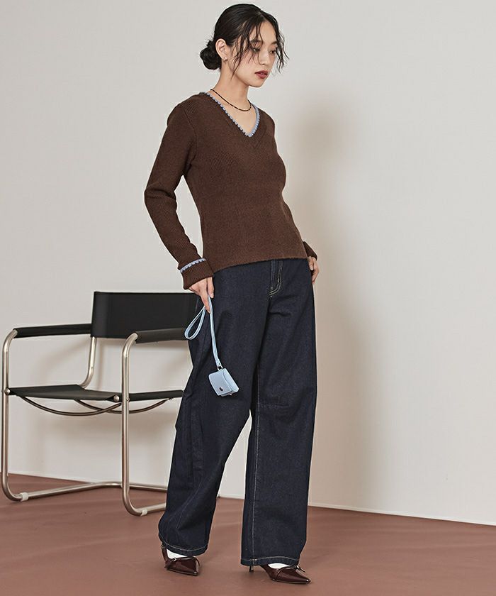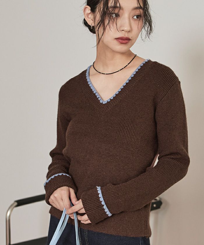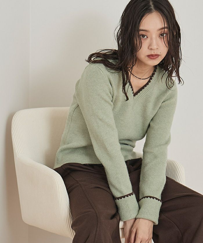 ・リメイク風の配色ステッチが映えるVネックロールアップニット