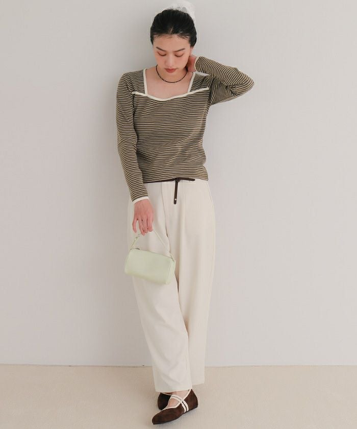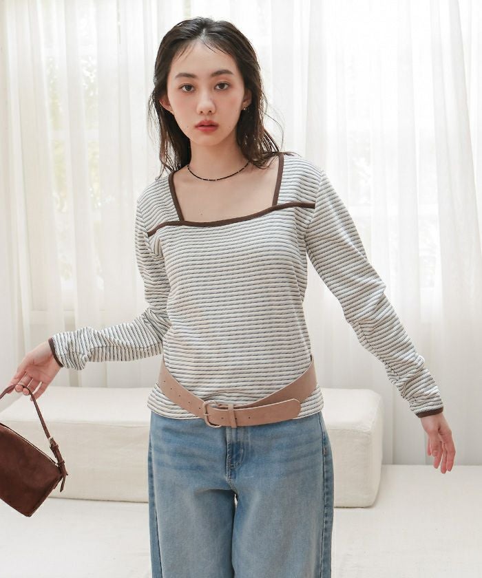 ・配色パイピングがポイントの変形スクエアネックトップス