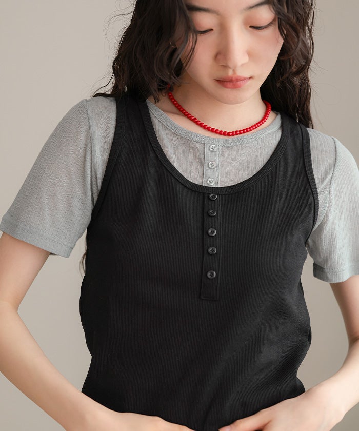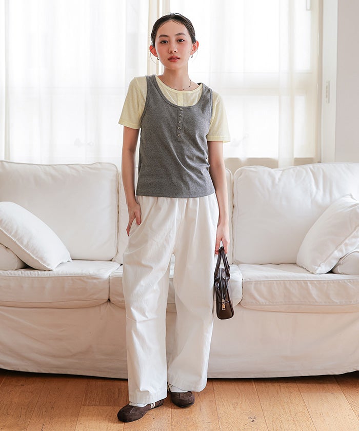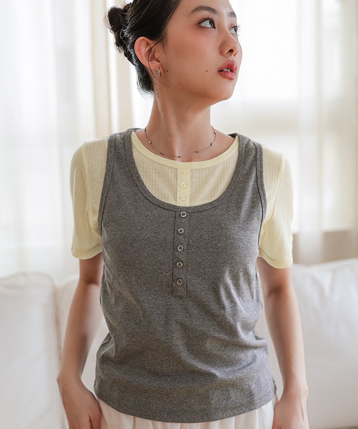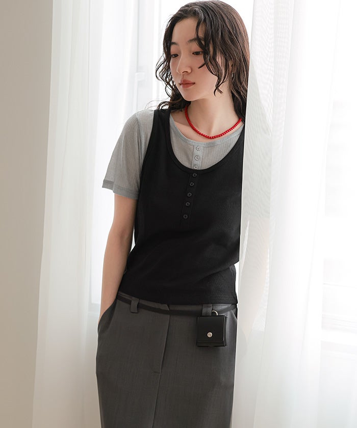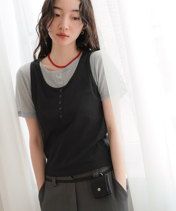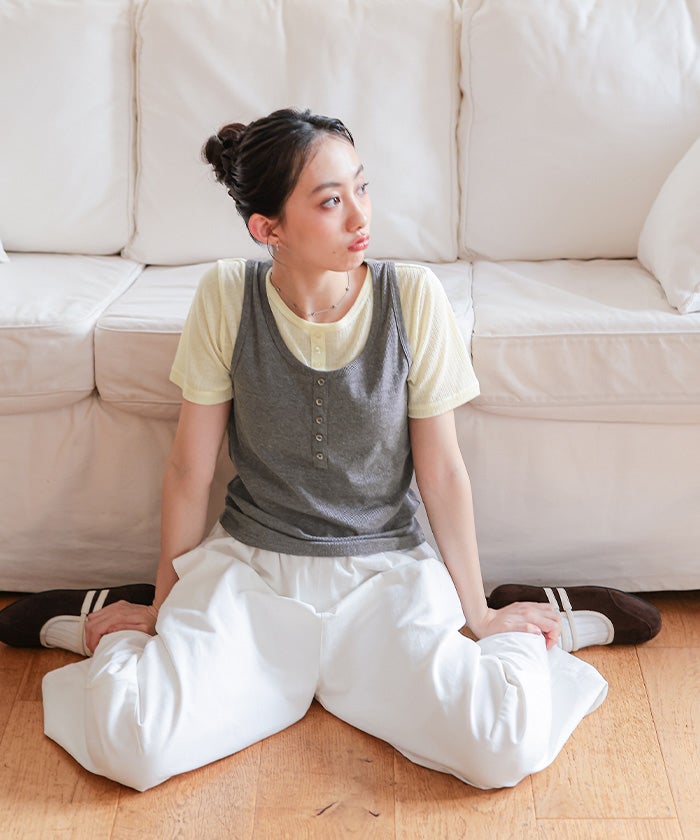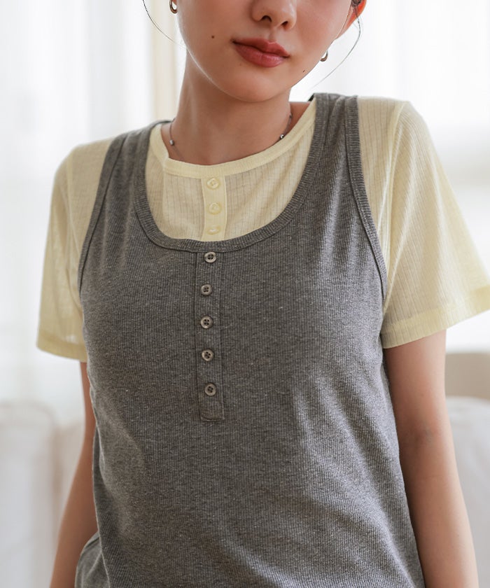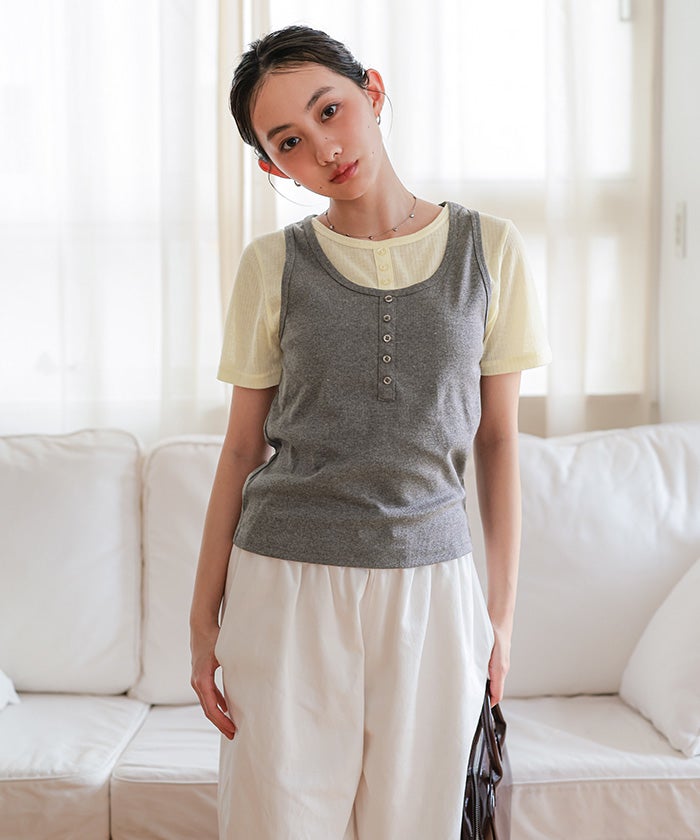 ・重ね着風デザインで、シンプルながらもこなれ感のある半袖トップス