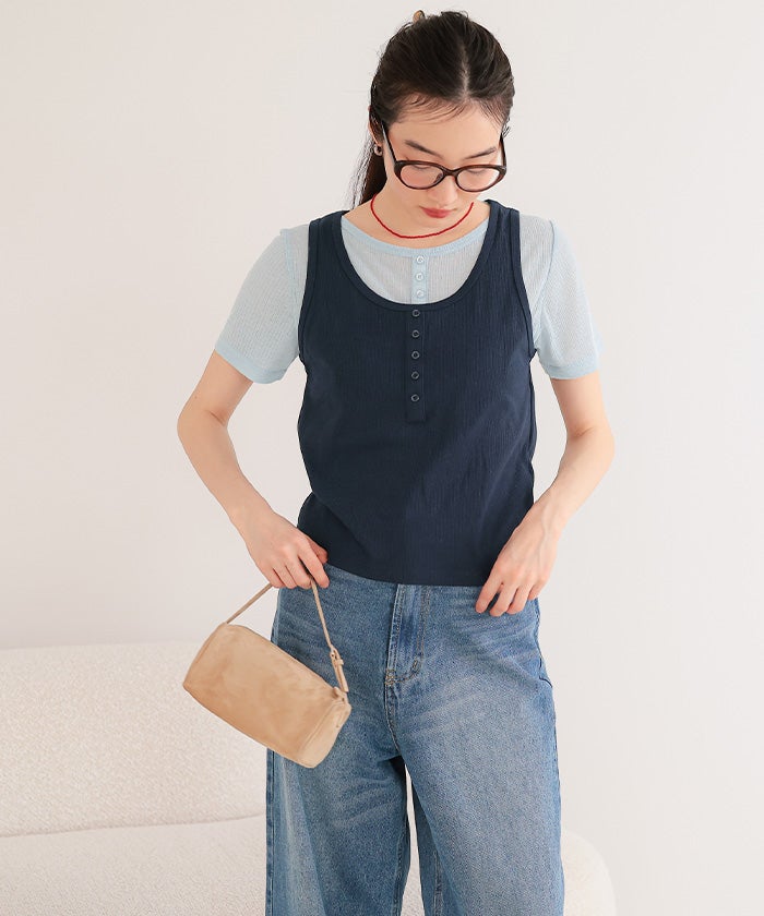 ・シアー素材の配色とボタンディテールがさりげないポイント