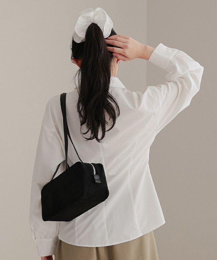 ・同素材のシュシュが付いたすっきり見えるパネルライン仕立てブラウス