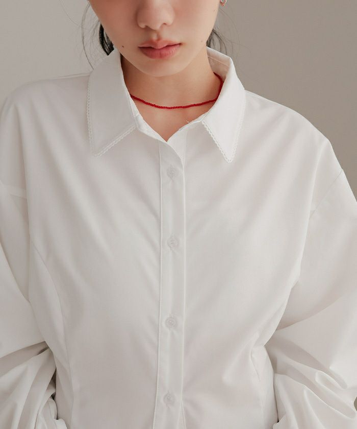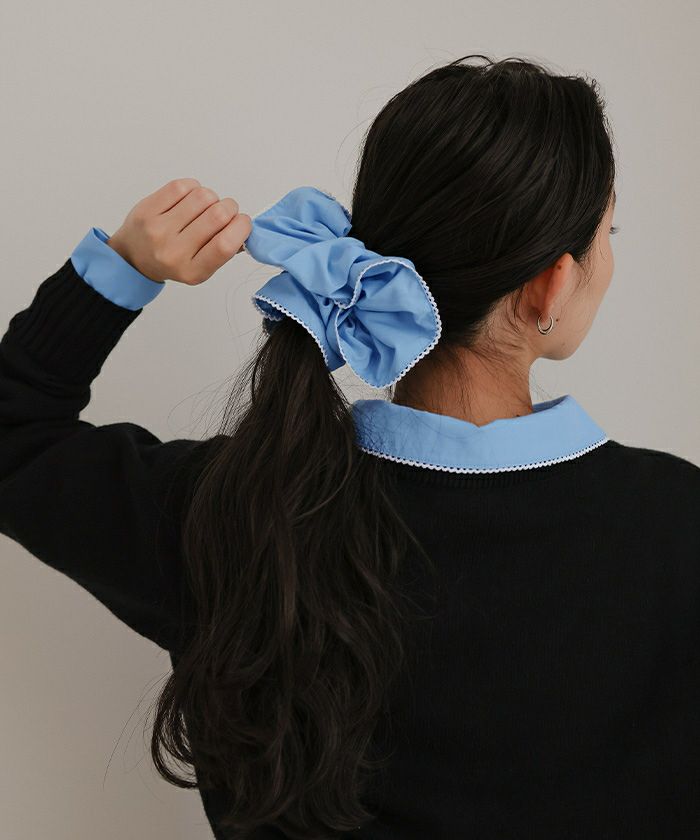・ブラウスとシュシュにレースパイピングがデザインポイント