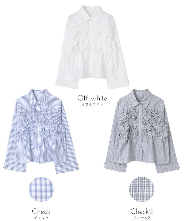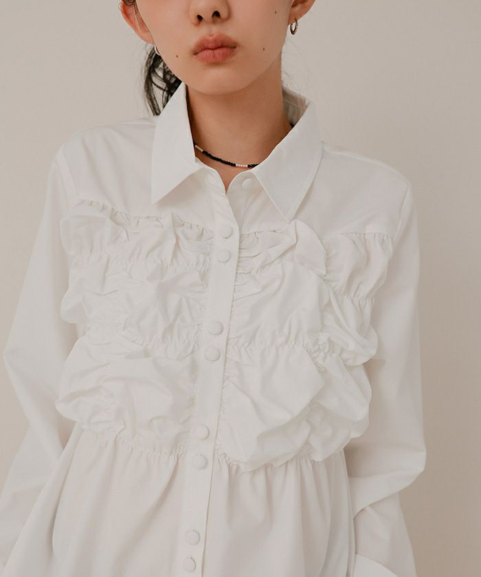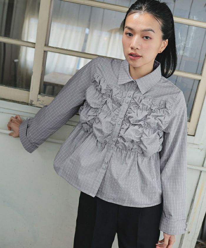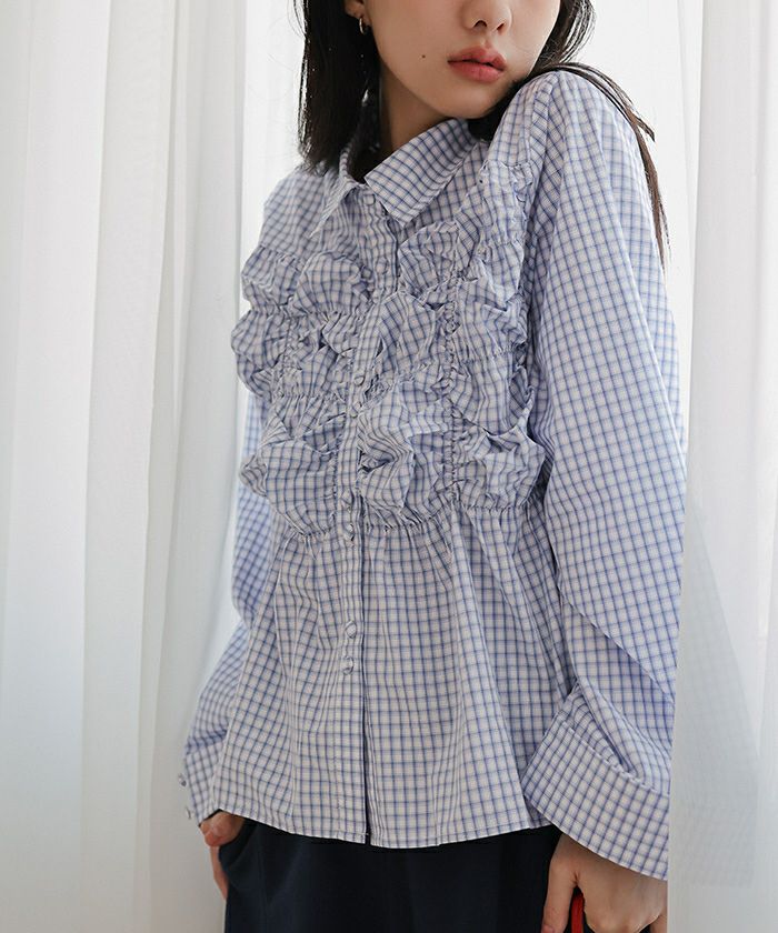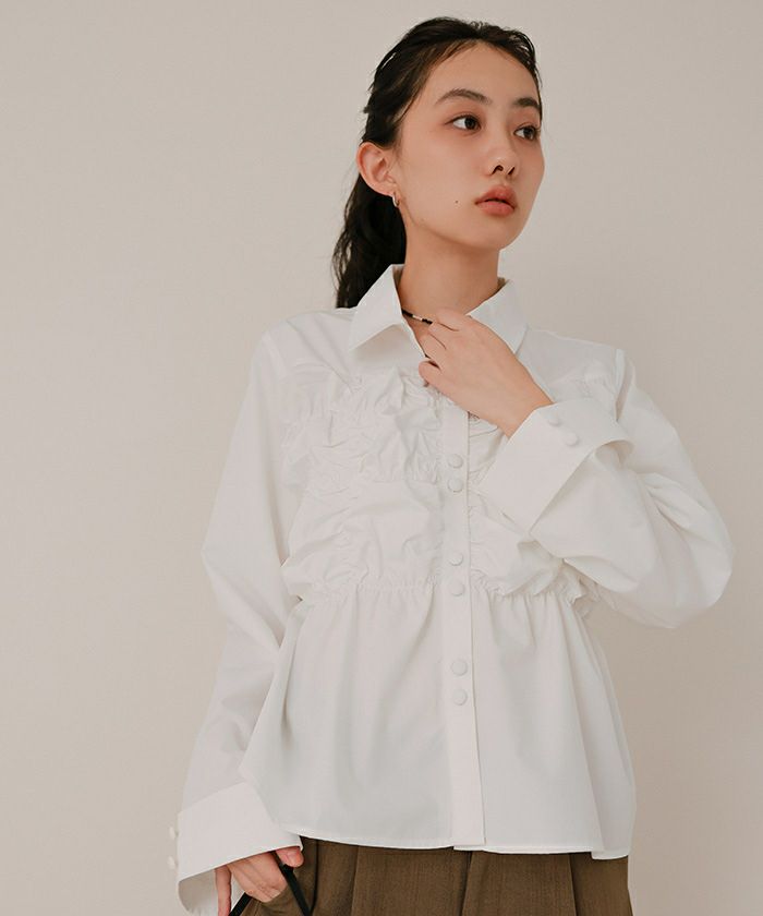 ・フロントのギャザーデザインとトレンドの2連ボタンがポイントのブラウス