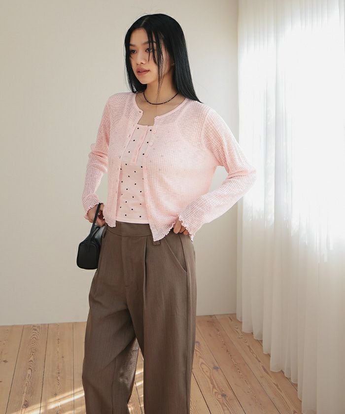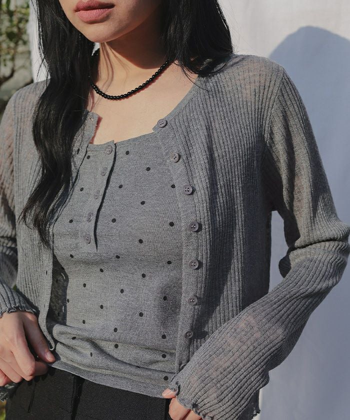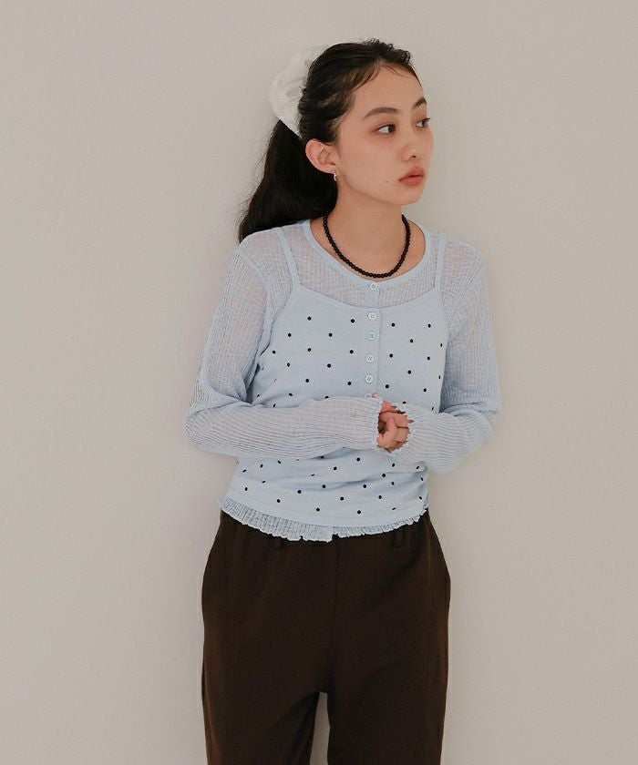 ・シアーな透け感が軽やかなカーディガンと、ドットプリントが可愛いキャミソールのセットアイテム