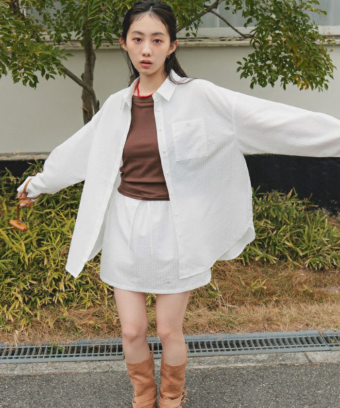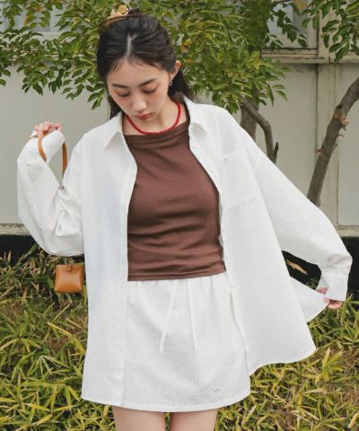 ・シャツはゆるめのシルエットで、微配色の濃いめクリアボタンがアクセント
