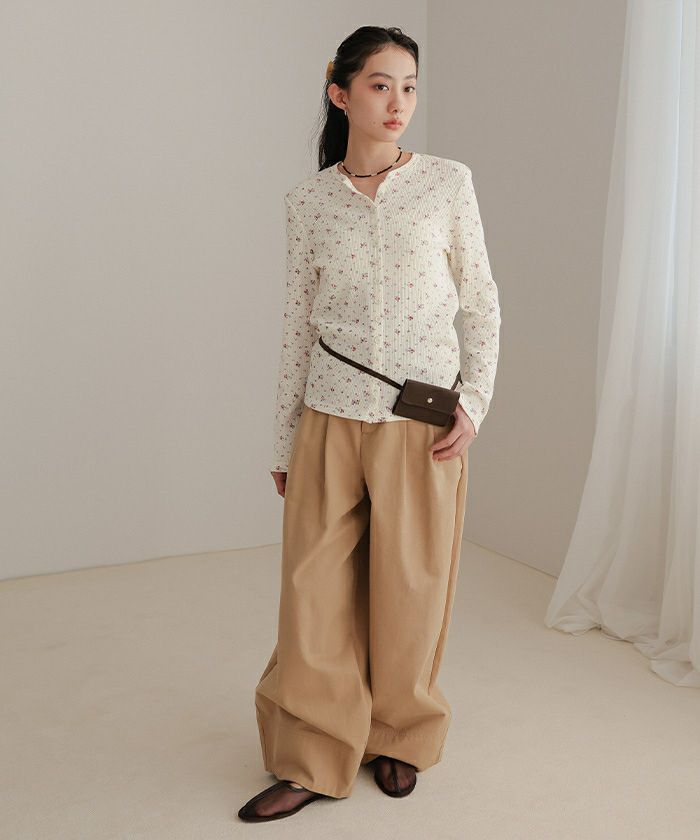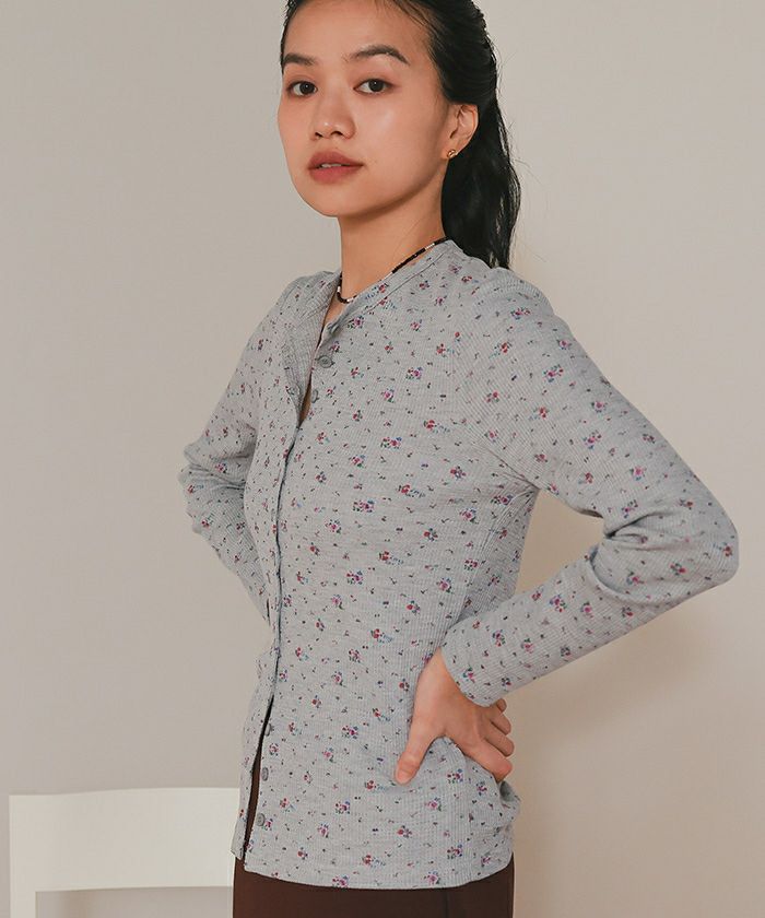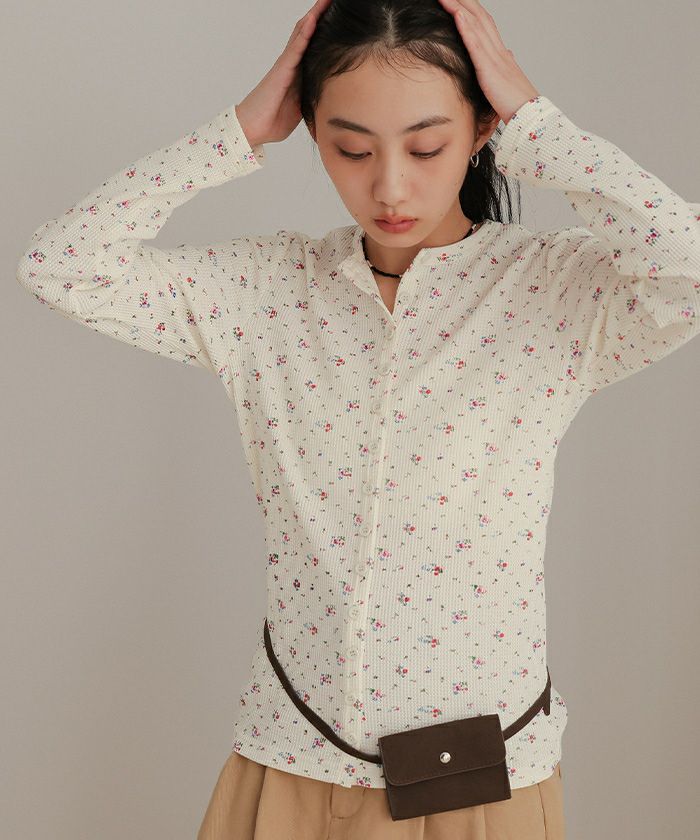 ・さりげない小花柄がポイントのワッフルカーディガン