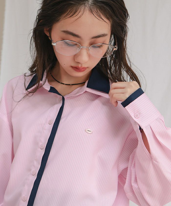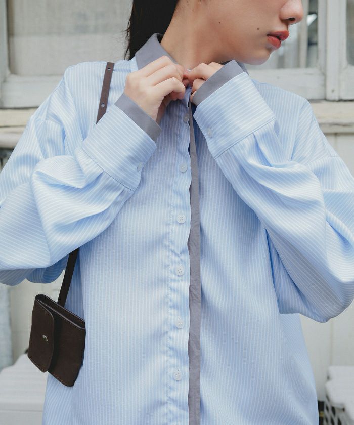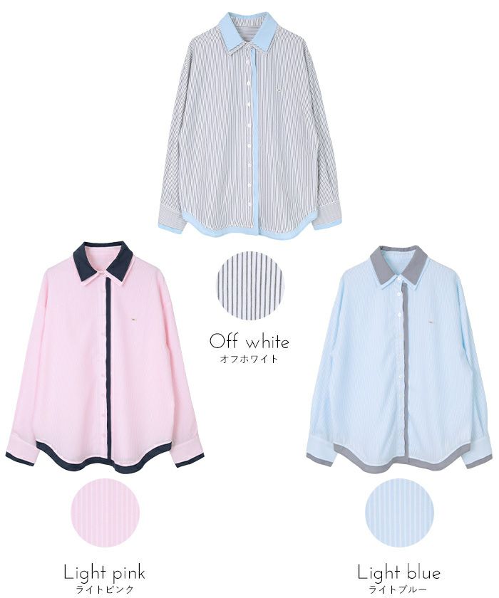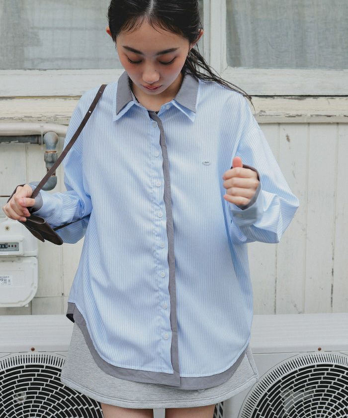 ・ストライプ柄に無地配色を効かせたレイヤード風デザインがポイントのシャツ