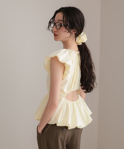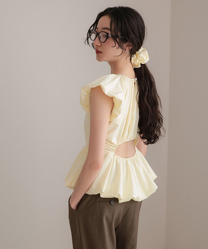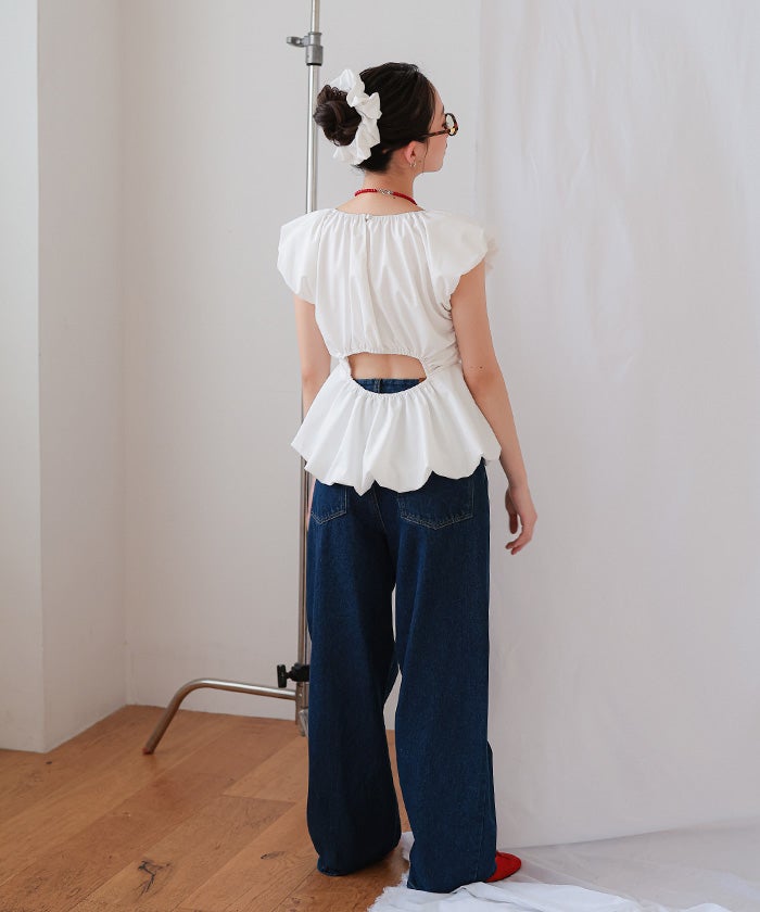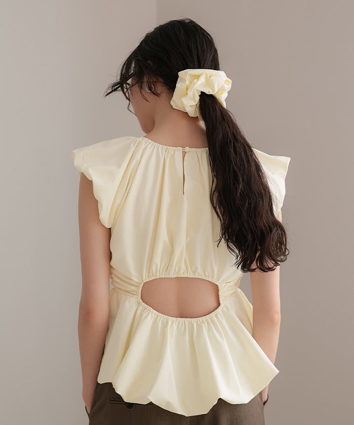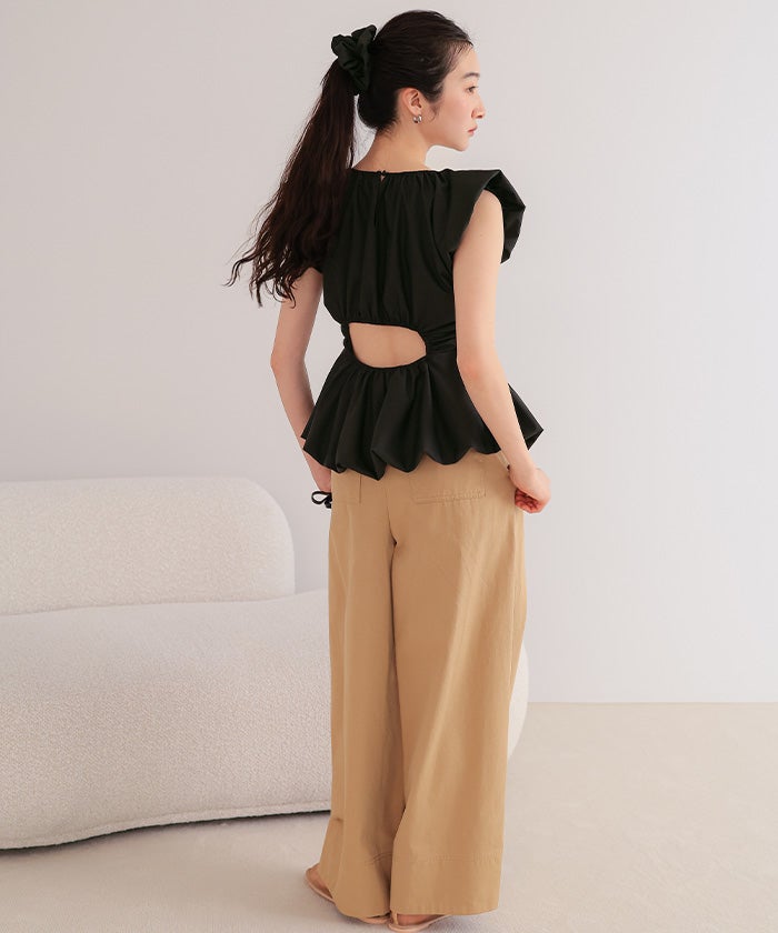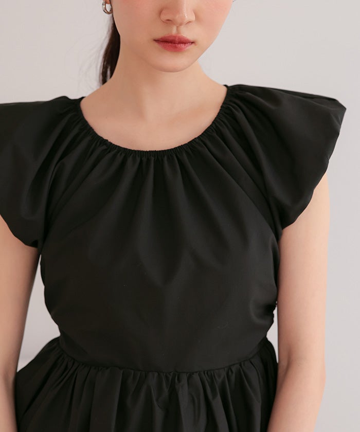 ・衿ぐりとウエスト部分にギャザーを施し、後ろの開きデザインが程よい肌見せで抜け感をプラス◎