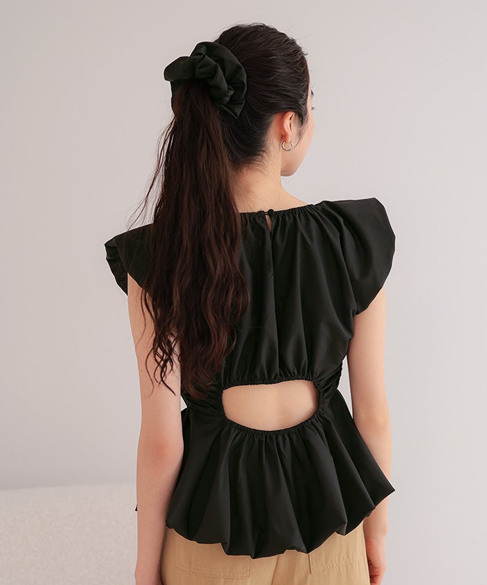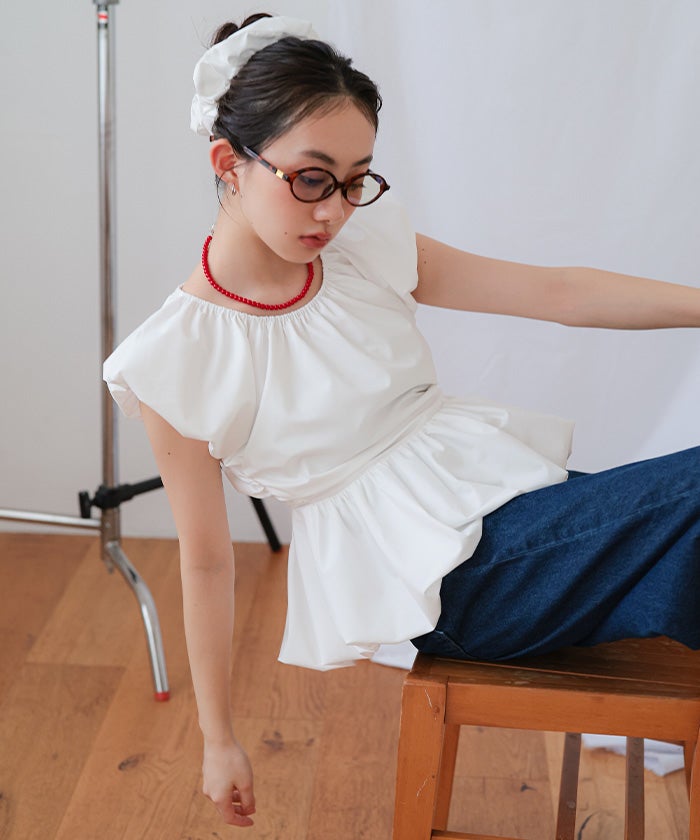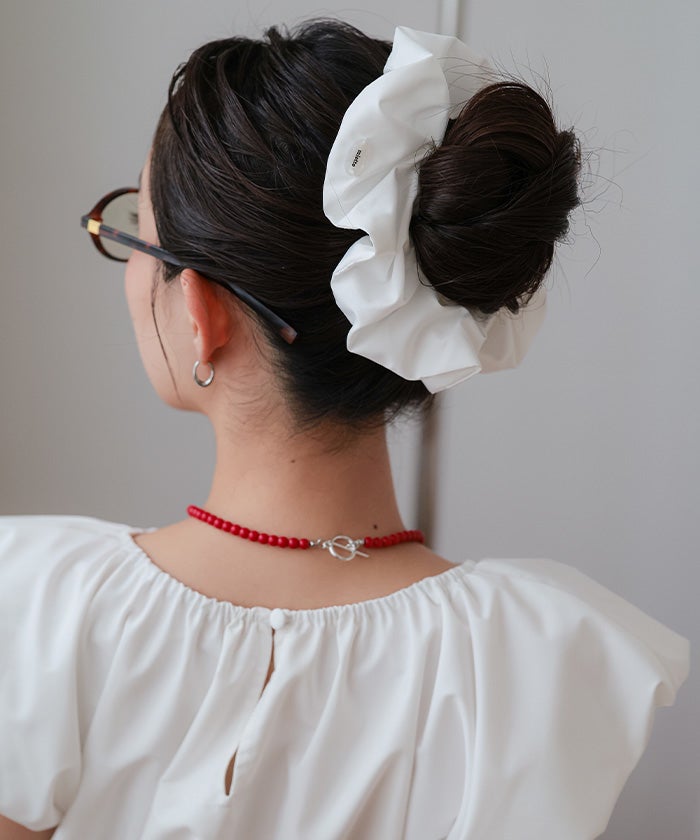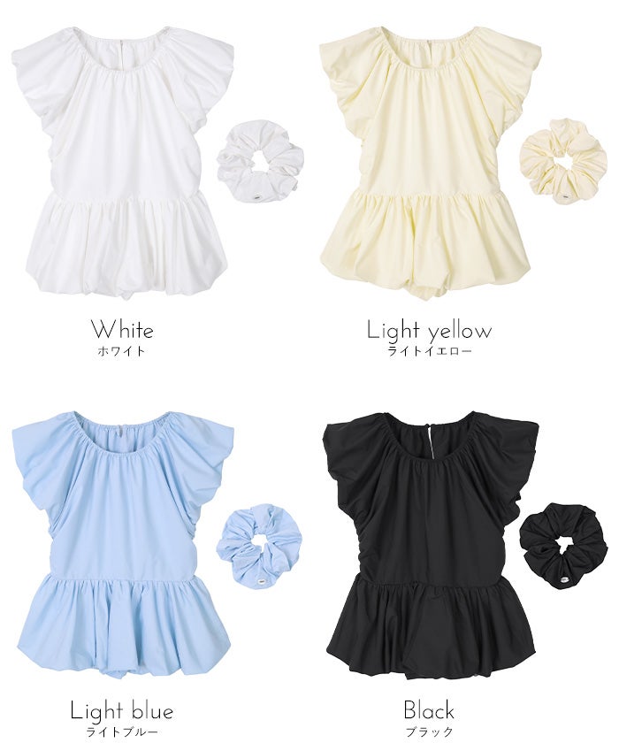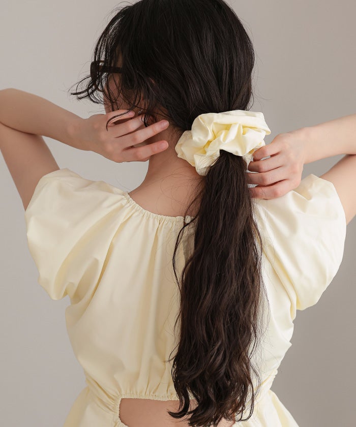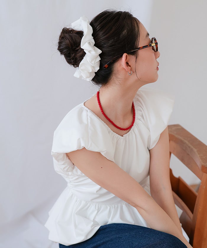 ・ふんわりとしたバルーンシルエットが女性らしさを引き立てるデザインブラウスとシュシュのセット