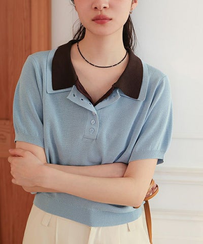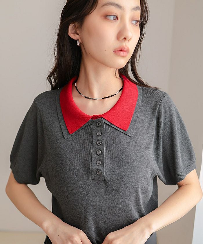・配色デザインの襟を重ねたような、レイヤード風デザインが目を惹く半袖ニット