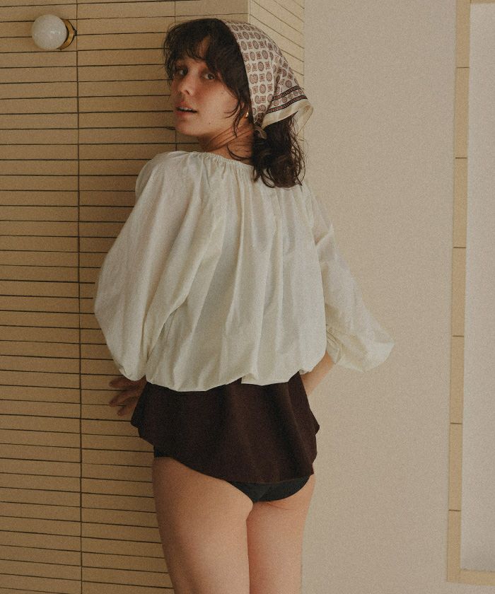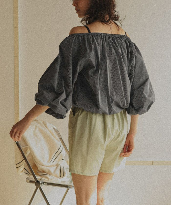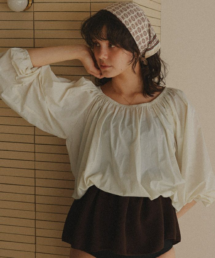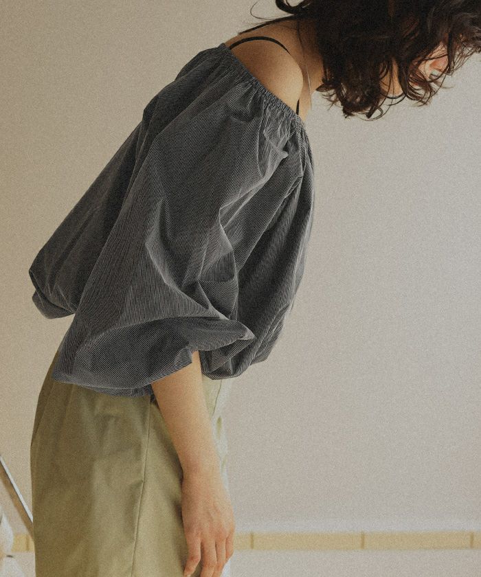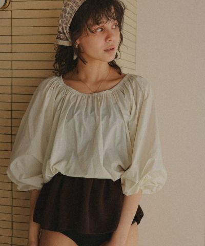 ・ネック部分がゴムギャザー仕様になっているので、ラウンドネックやオフショルダーなどお好きな形でスタイリングが可能です。