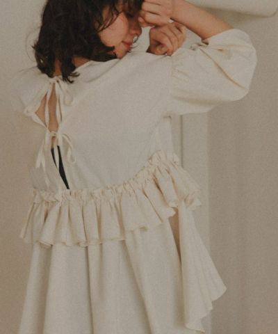 ・ボリュームのある長袖パフスリーブに背中のWリボンとレイヤードフリルがポイント◎