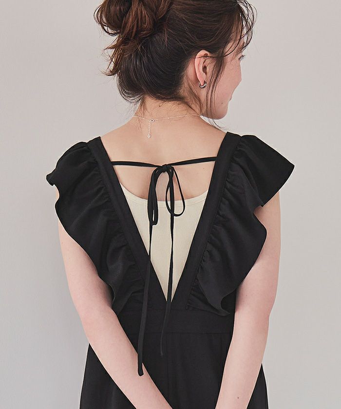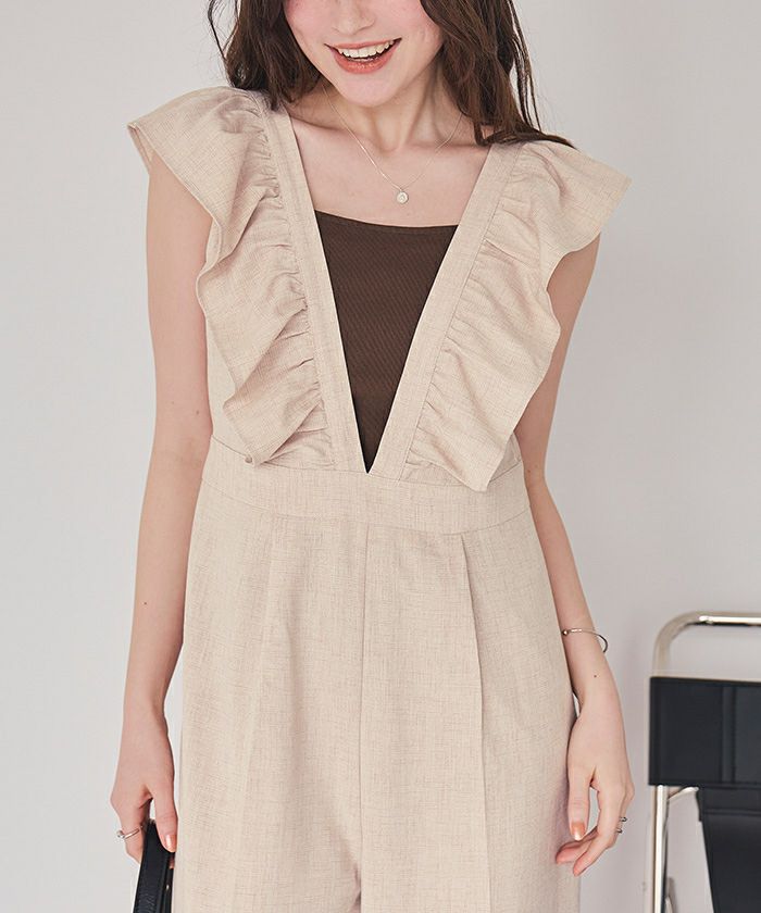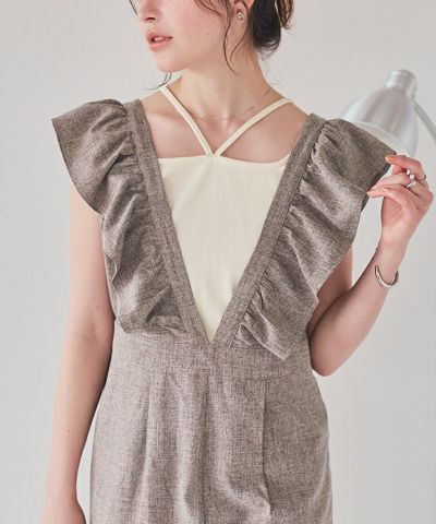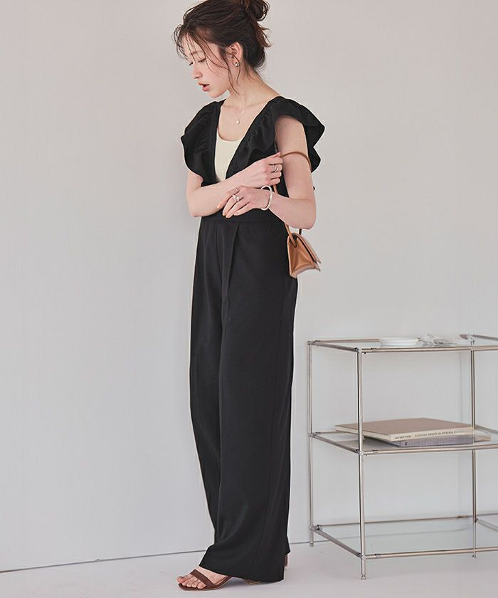 ・大人可愛いを演出するフリルデザインオールインワン。
