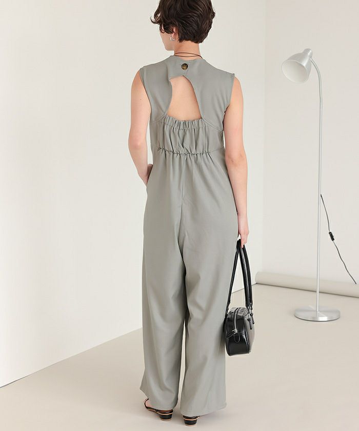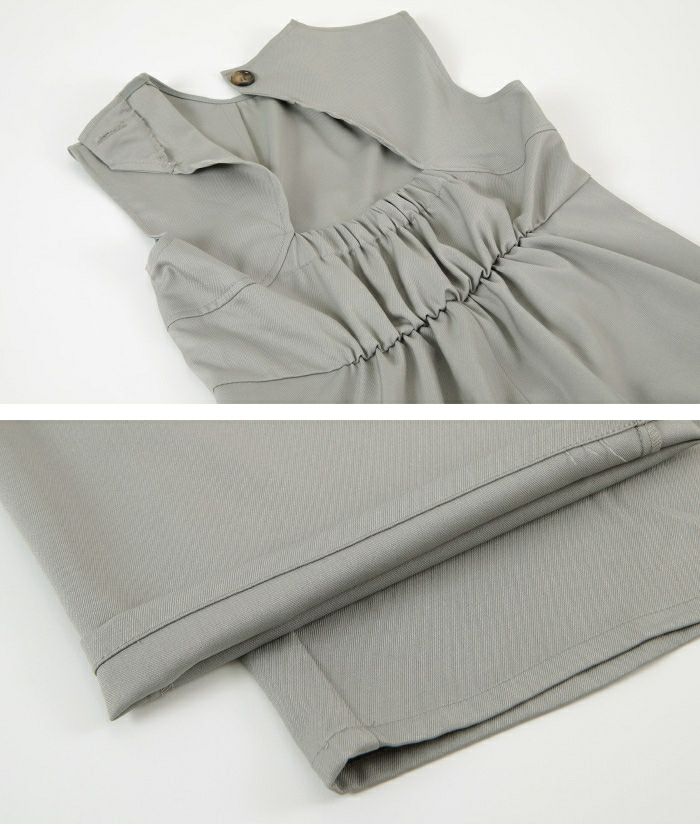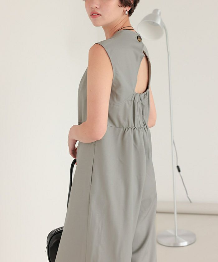 ・前はシンプルでスタイリッシュなのに後ろは大きな可愛いボタンがあり、バックオープンが目を惹く、ギャップにキュンとする一枚。