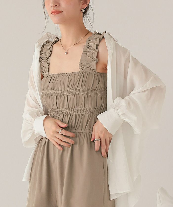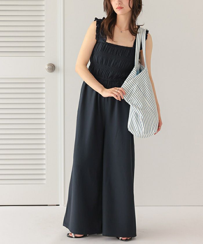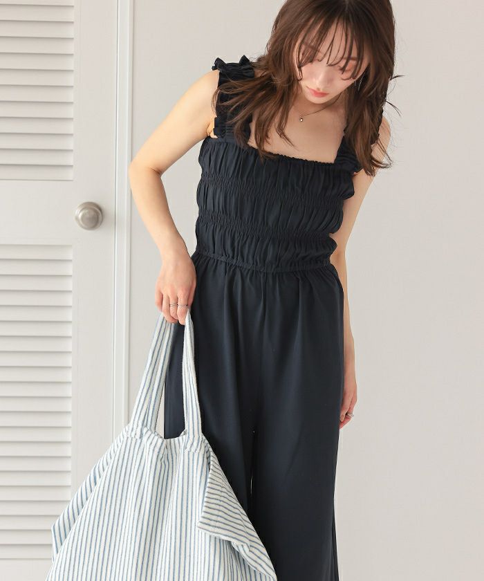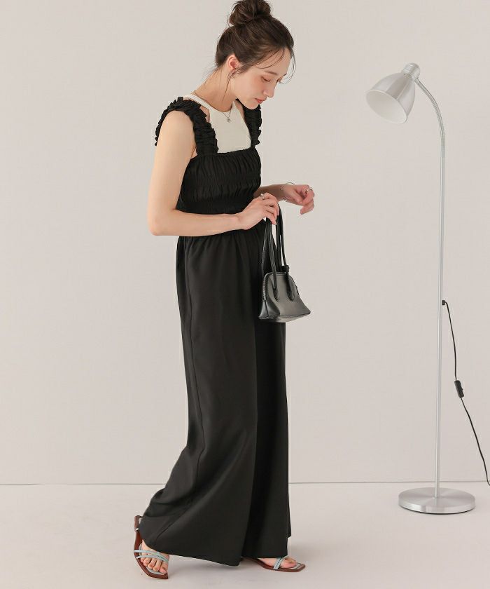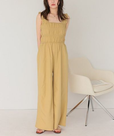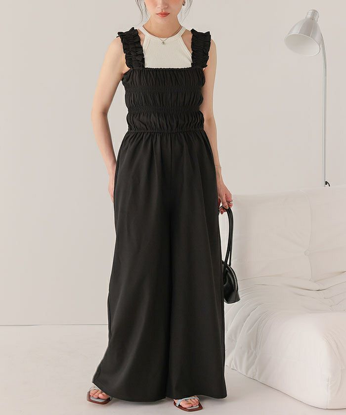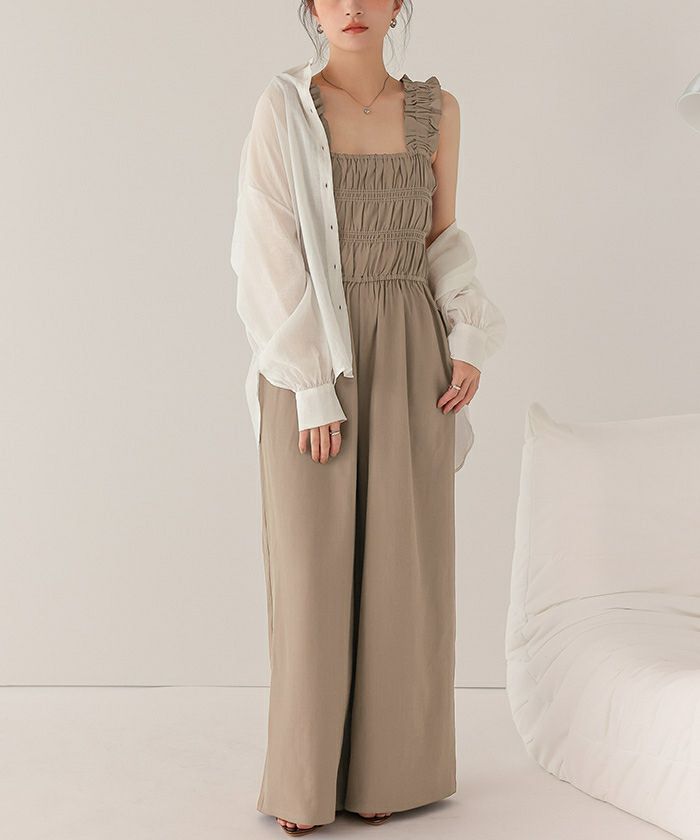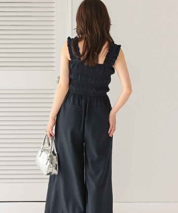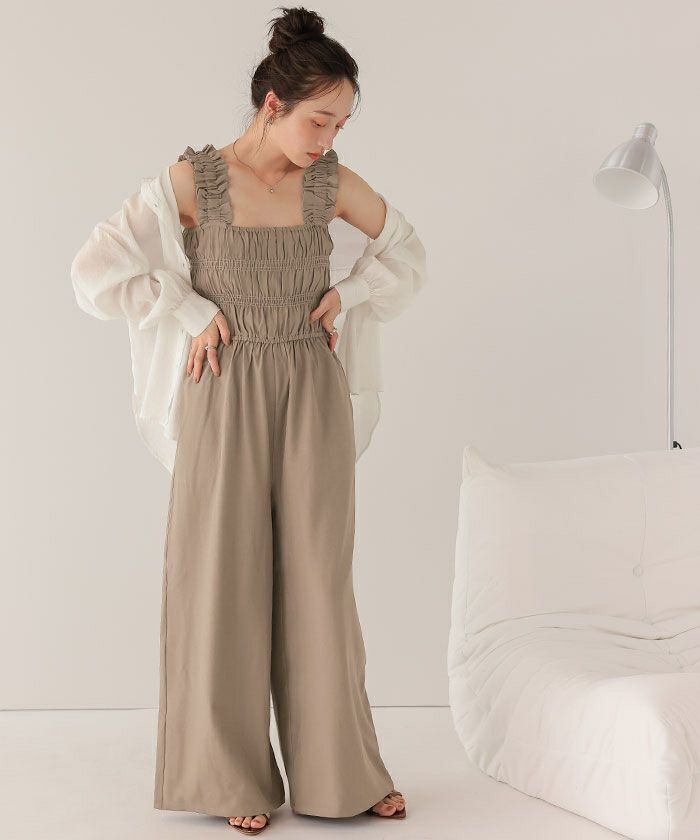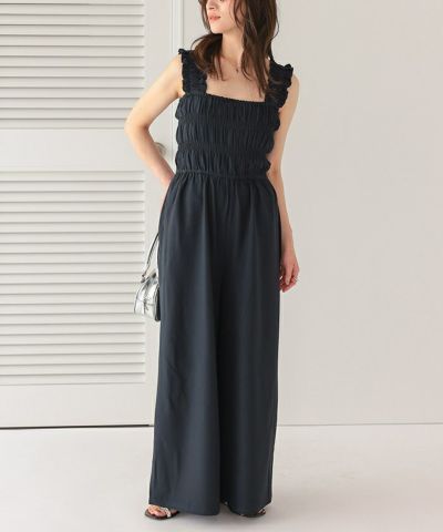 ・シャーリング加工がふんだんに施されたボリューミーなオールインワン。