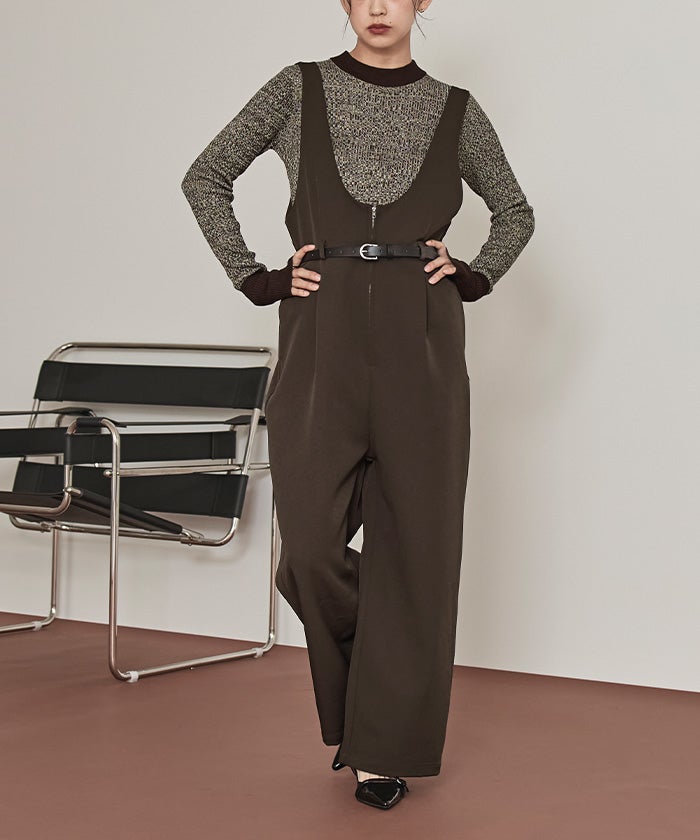 ・深めのUネックがポイントのベルト付きサロペットパンツ。