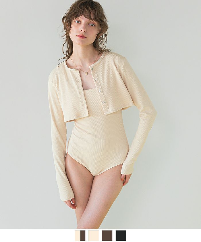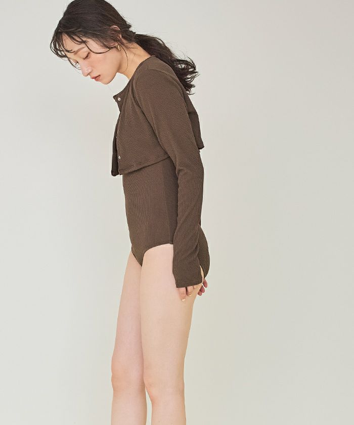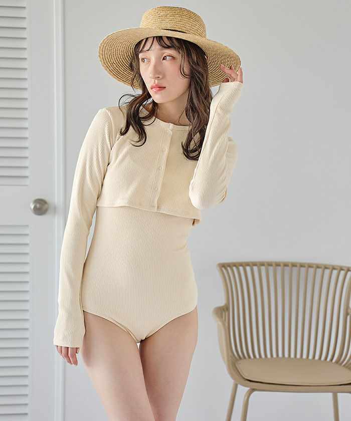 ・リブワンピース水着と同素材の長袖ショート丈カーディガン付きのセット商品。
