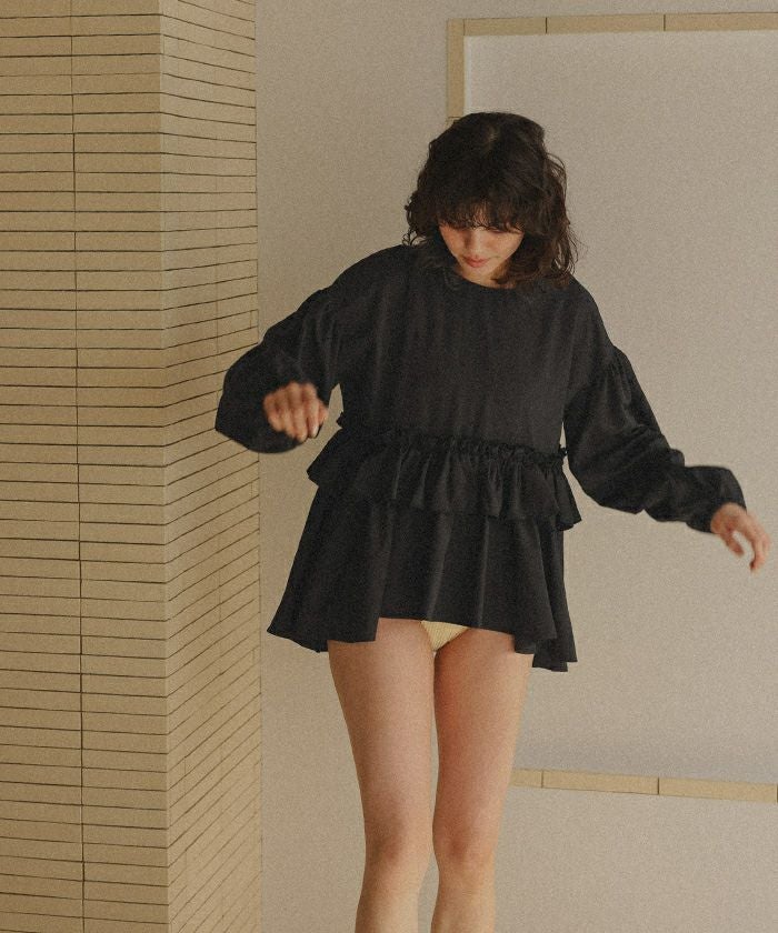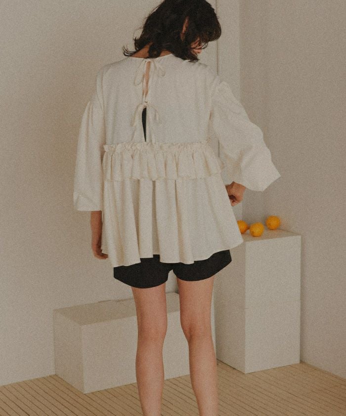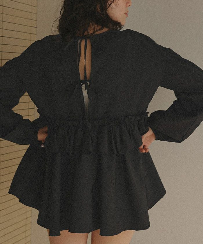 ・ボリュームのある長袖パフスリーブに背中のWリボンとレイヤードフリルがポイント◎