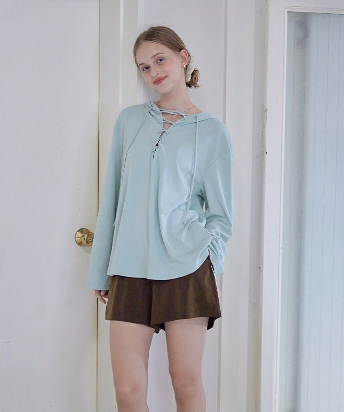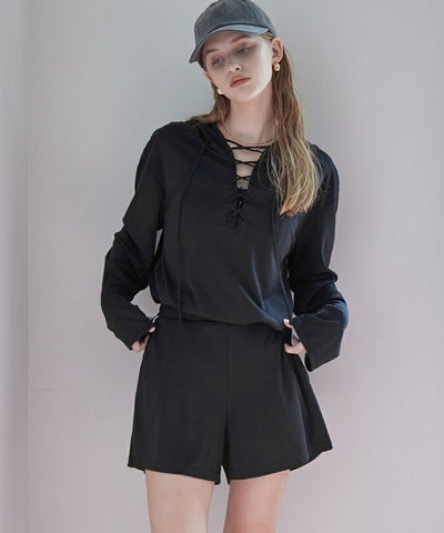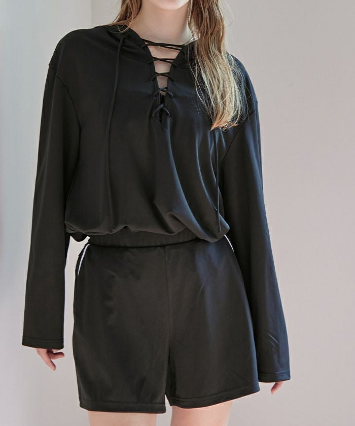 ・胸元のレースアップデザインが目を引く、ラッシュガードとショートパンツのセット。
