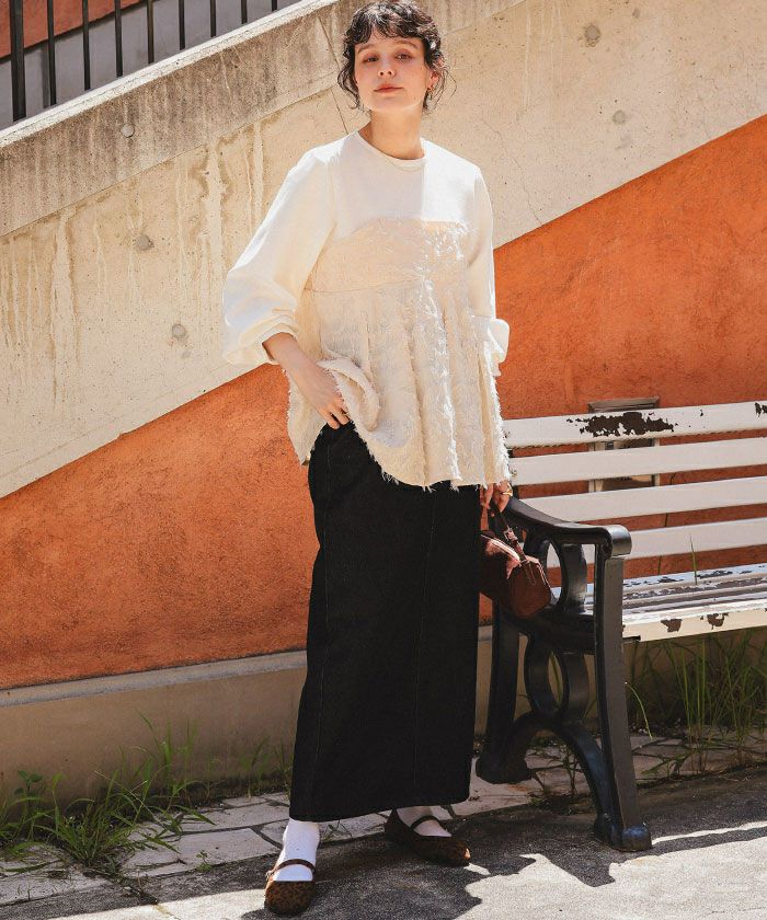 ・程よい厚みとハリのあるデニム素材で体のラインを拾いすぎずスタイルアップ見えを実現