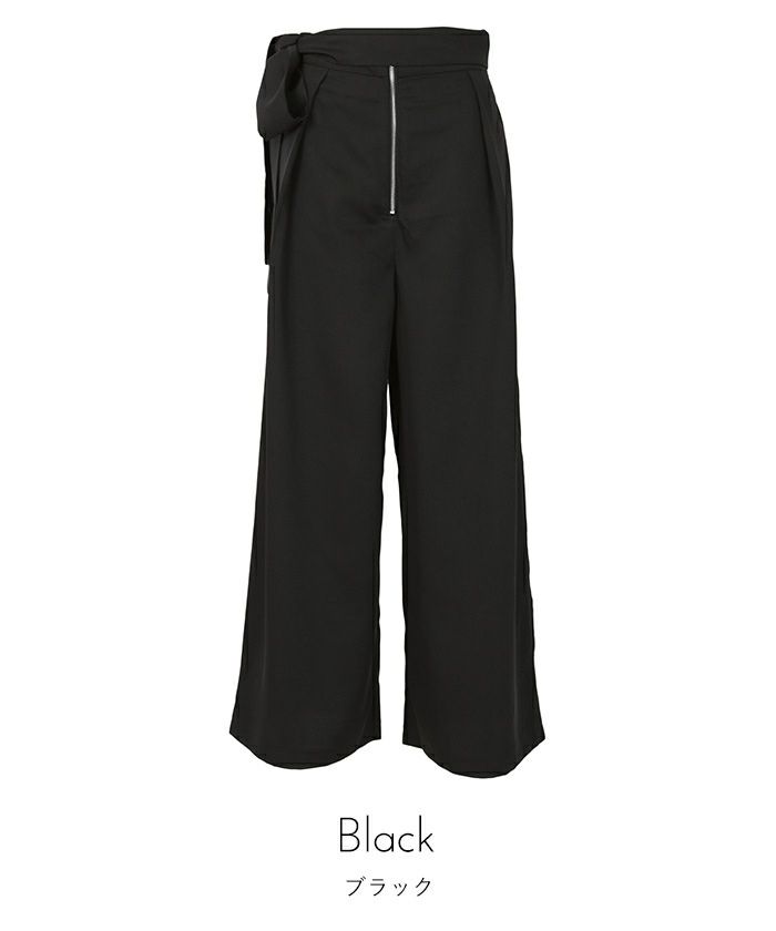 ・サイドリボンとフロントジップがアクセントになったワイドパンツ。