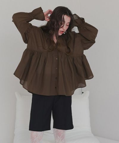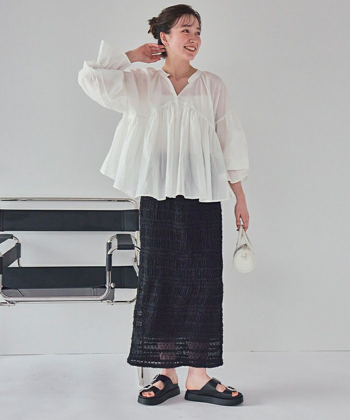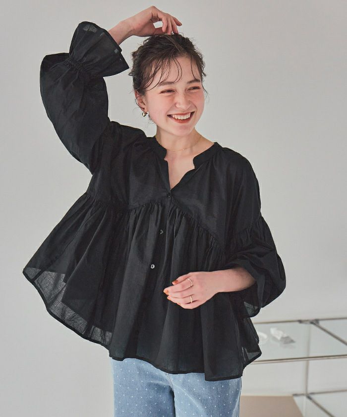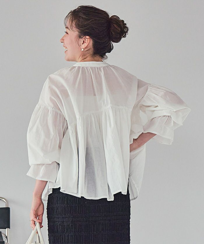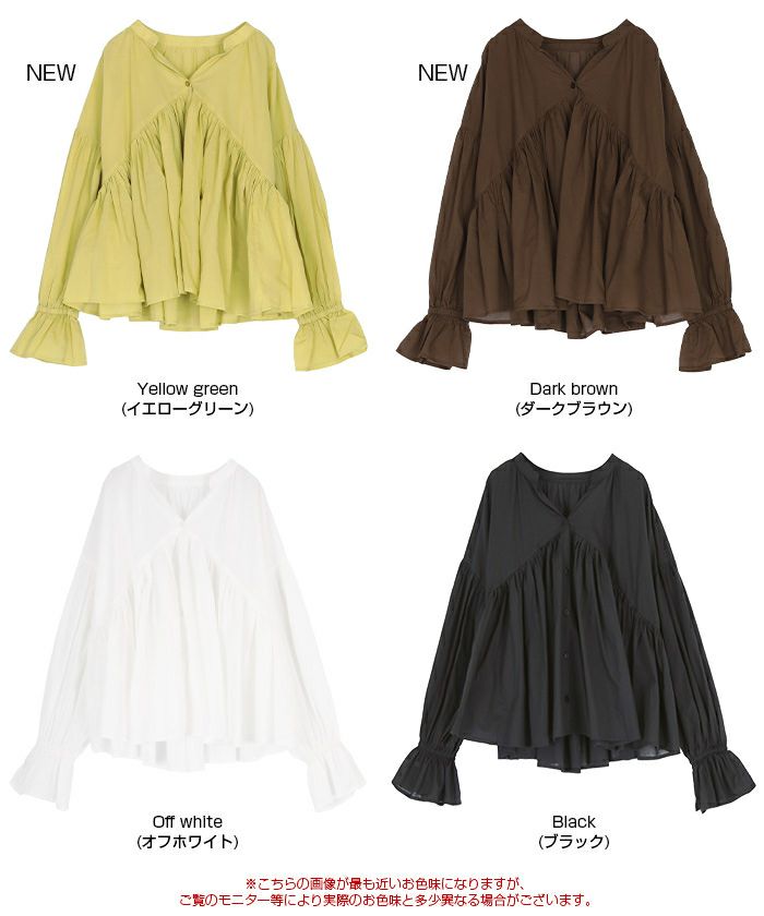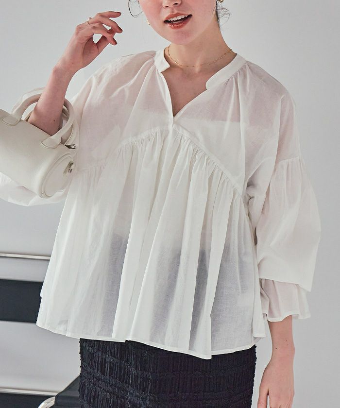 ・胸元の切り替えから広がるギャザーデザインがポイントのブラウス。