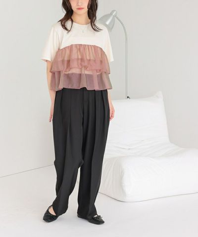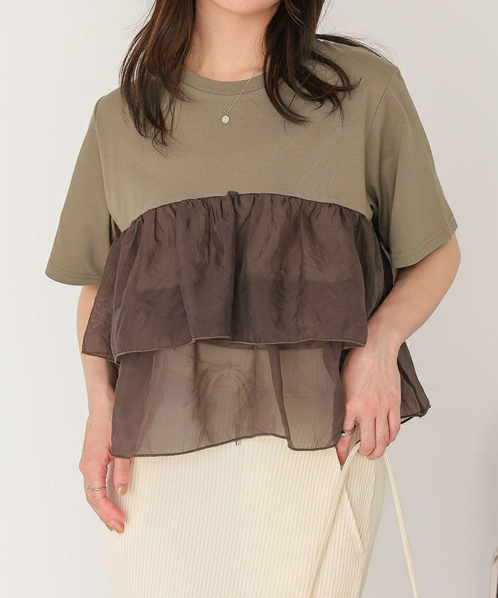 ・カジュアルなTシャツにオーガンジーフリルが目を惹く一着