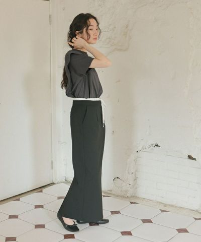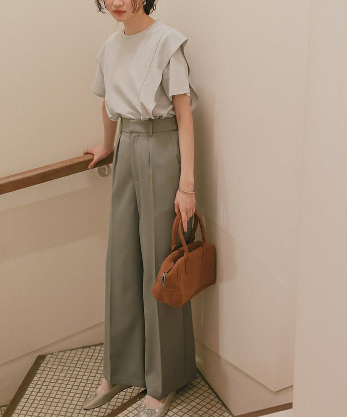 ・肩から裾にかけてラッフルデザインが程よく女性らしく、スタイリッシュな雰囲気に。シンプル過ぎない、一枚で様になるTシャツに。