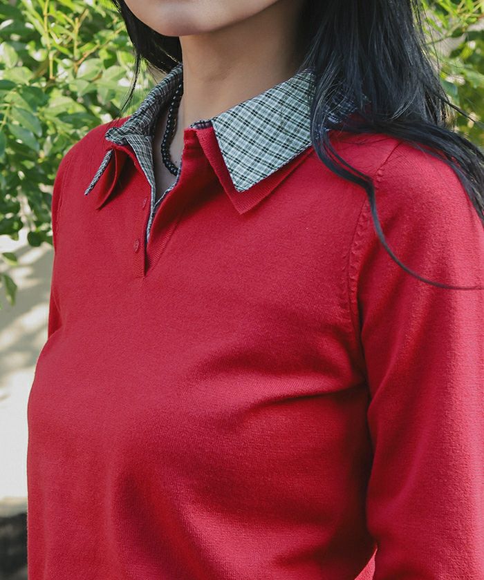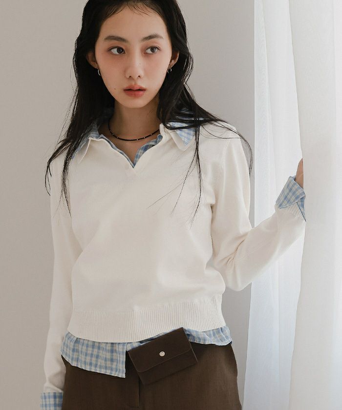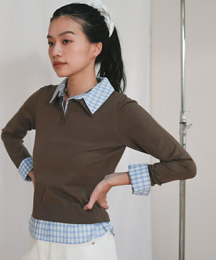 ・襟・袖口・裾にシャツ生地をドッキングした、レイヤード風デザインのポロニット
