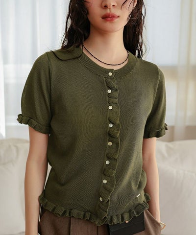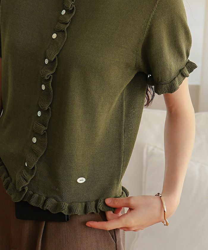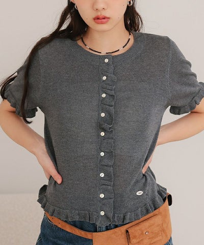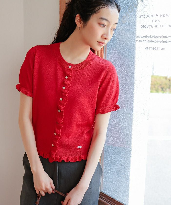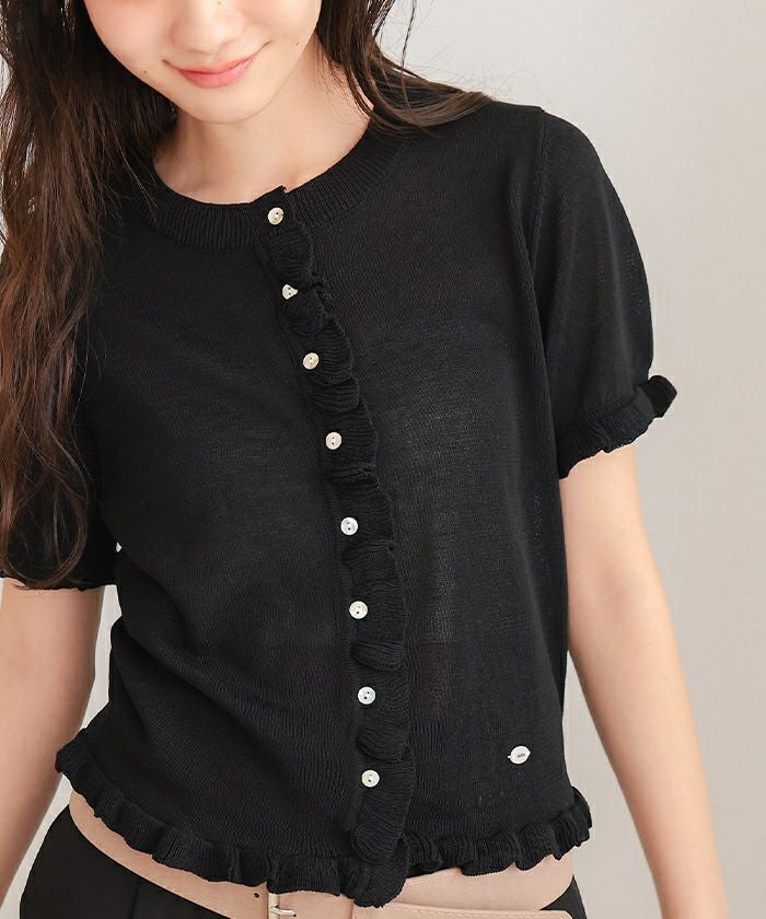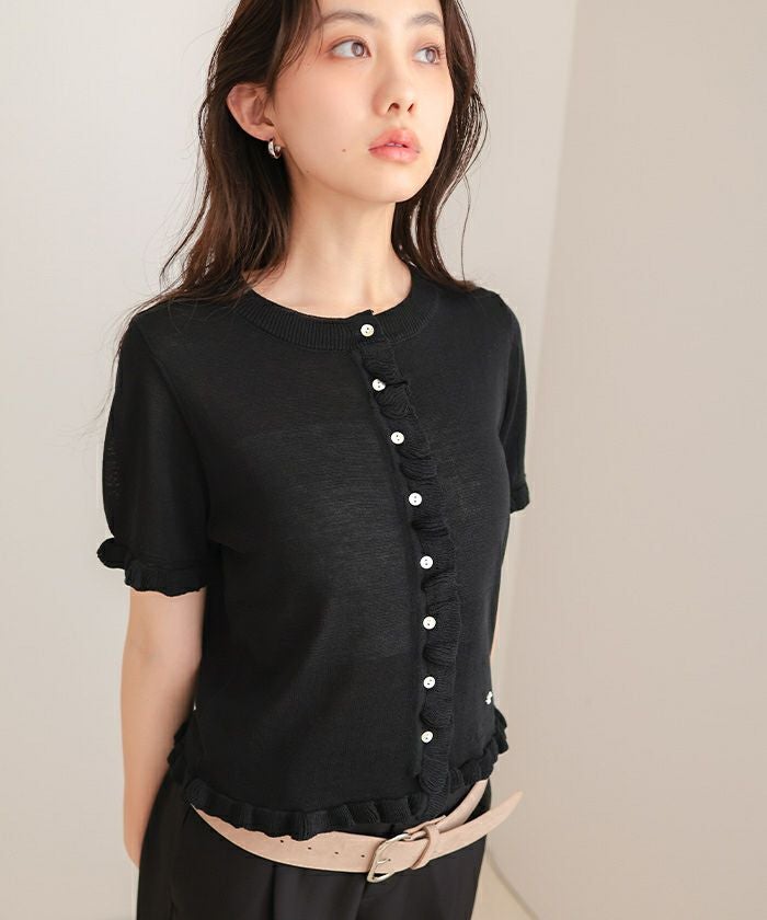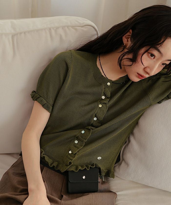 ・フリルデザインがポイントの半袖ニットカーディガン