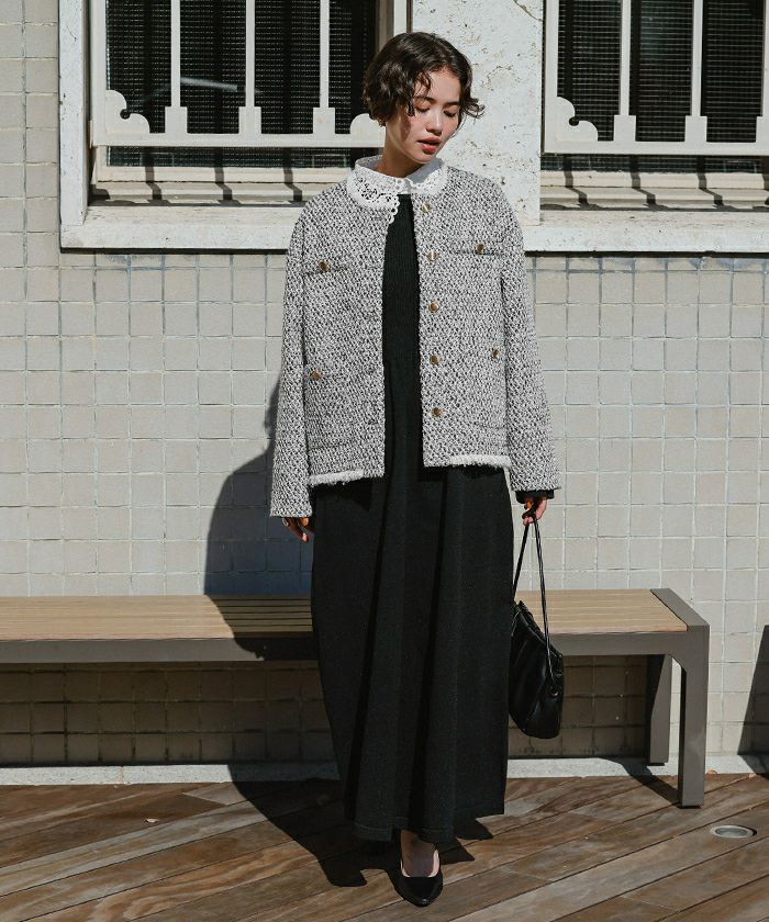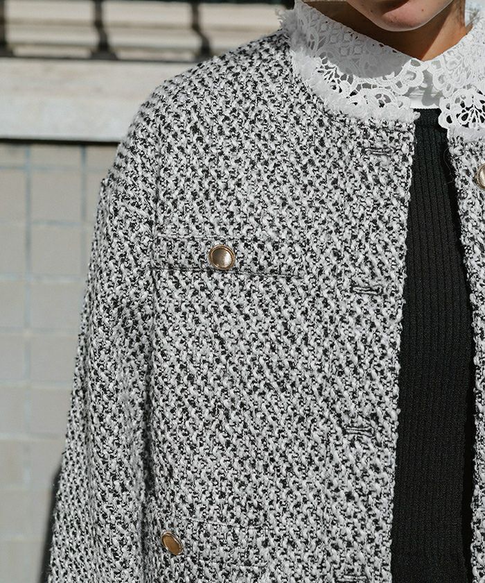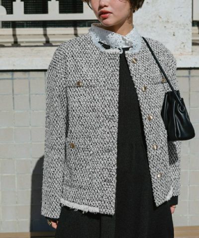 ・トレンドのツイード素材を使用したジャケット。