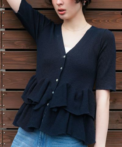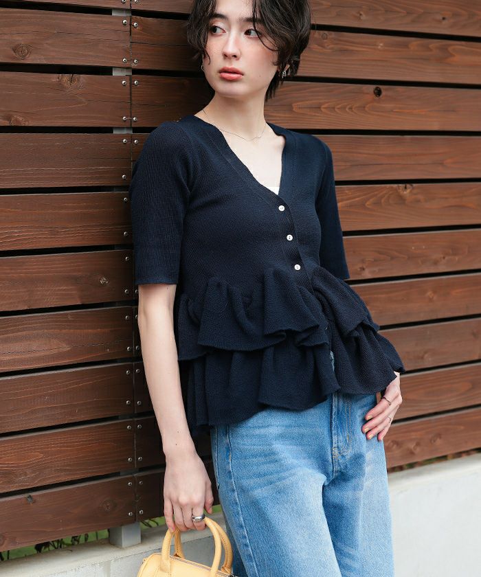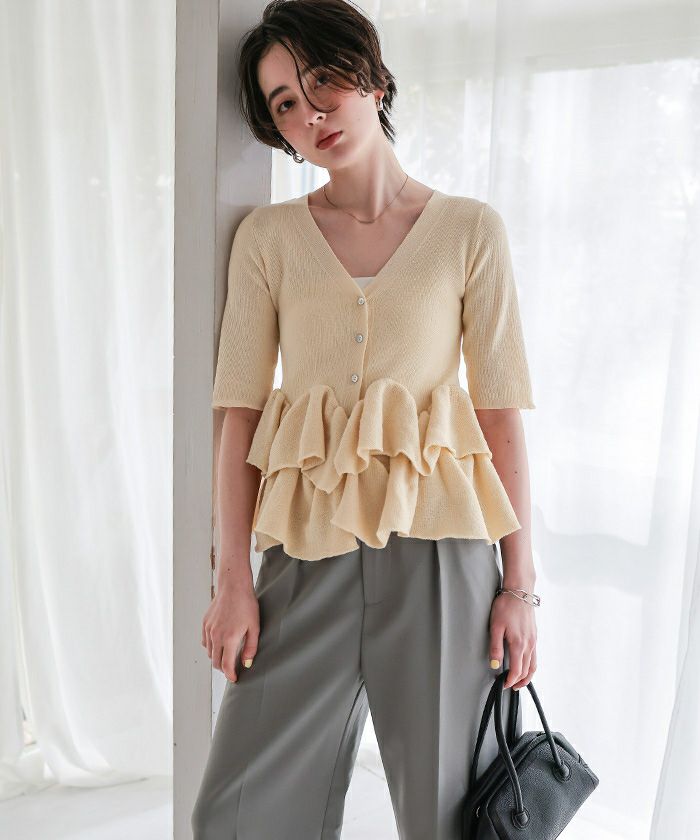 ・ランダムフリルヘムが目を惹く半袖ニットカーディガン
