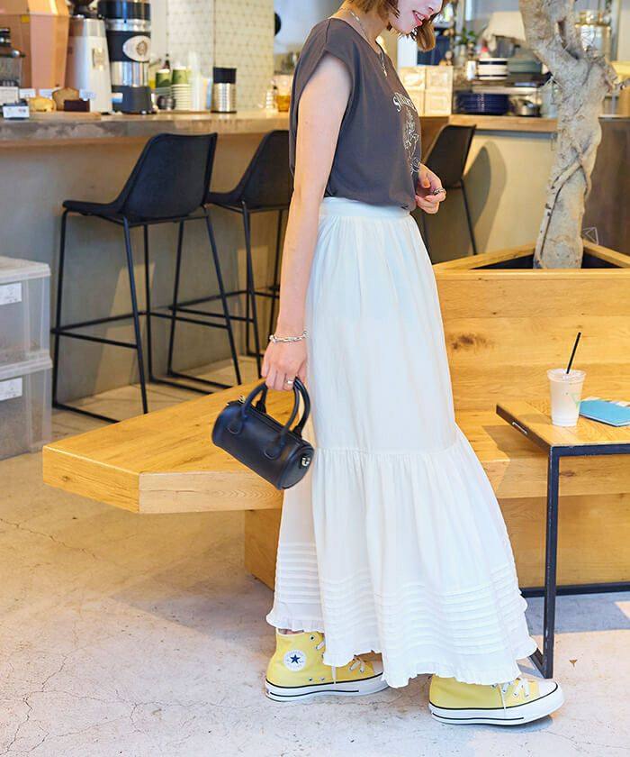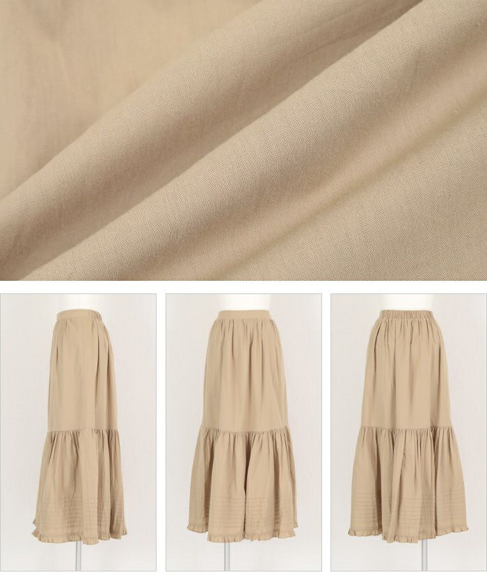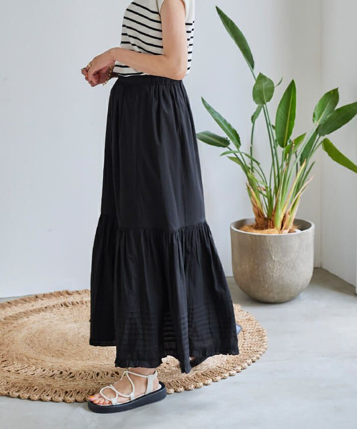 ・裾のフリルとティアードデザインが大人かわいいロングスカート。