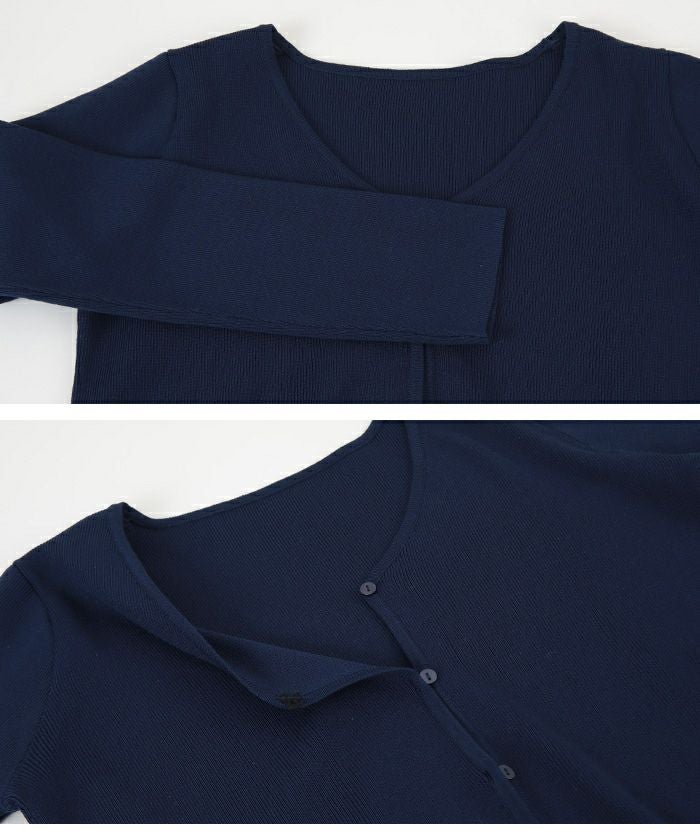 ・深めのVネックやボタンループ仕様でインナー見せを楽しめる1枚。