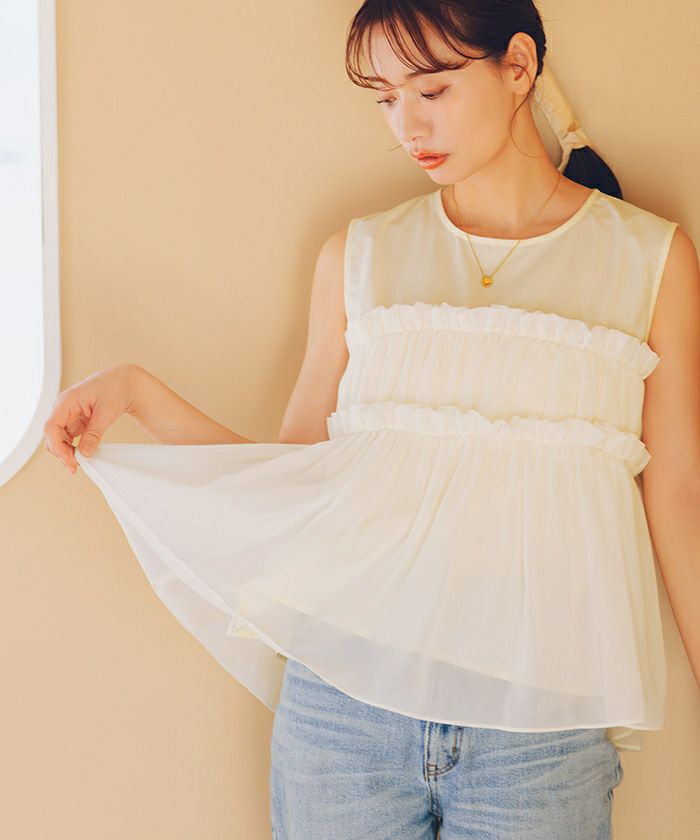 ・たっぷりとギャザーの入った、メリハリのあるシルエットがかわいいノースリーブトップス