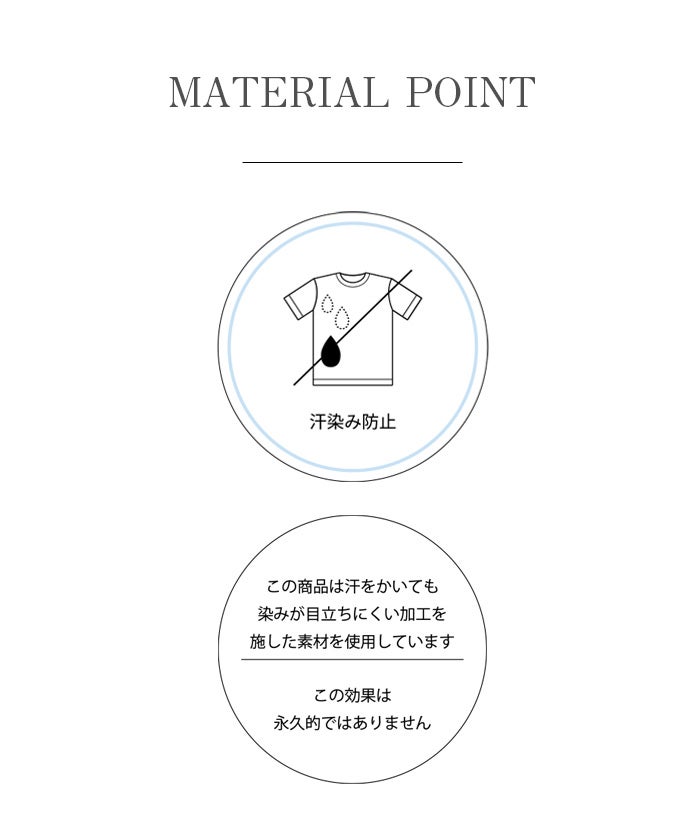 素材の特性上、汗染み防止加工は洗濯を繰り返すことや長期使用により、徐々に効果は低下いたします。予めご了承下さい。