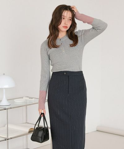 ・トレンドのヘンリーネックデザインに袖口の配色デザインがおしゃれなニット