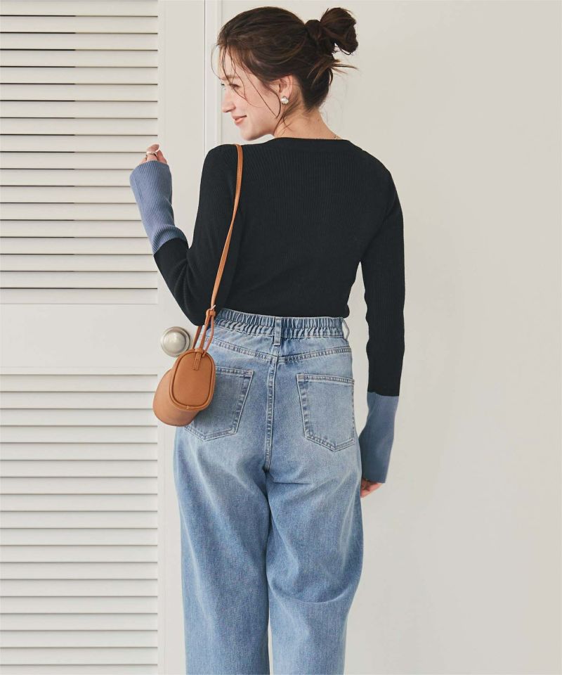 袖配色ヘンリーネックニット