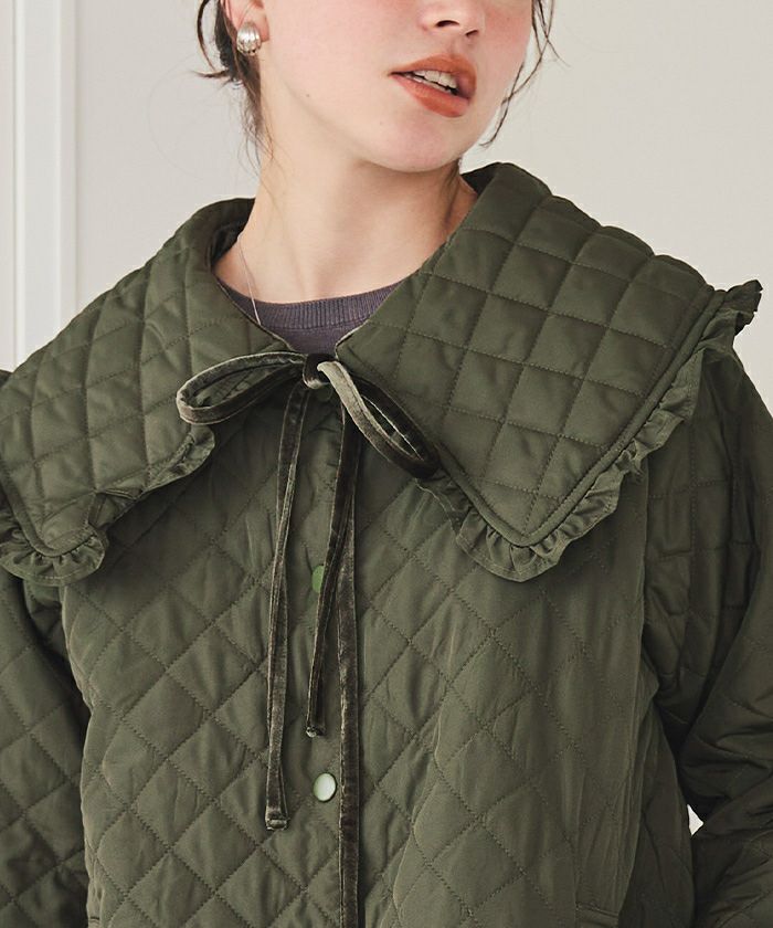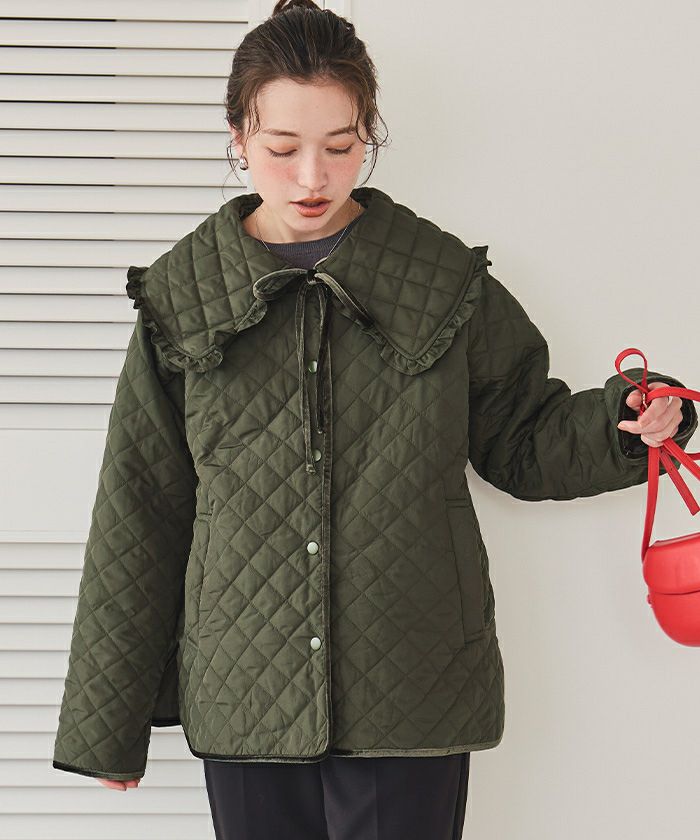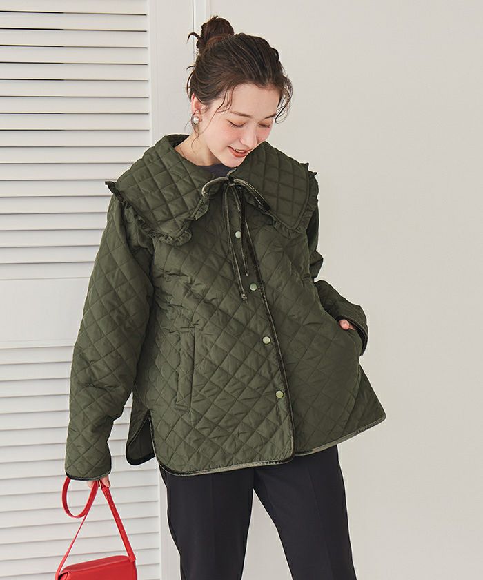 キルティングのアウターは軽くて着やすいから毎年買ってる気がします。 今年はこの襟付きが可愛すぎて即決でした。 ゆったりめなので中にボリュームのあるニットも着れそうで◎ 子供との公園に行く時は襟外したらもっと動きやすくなって便利です!!