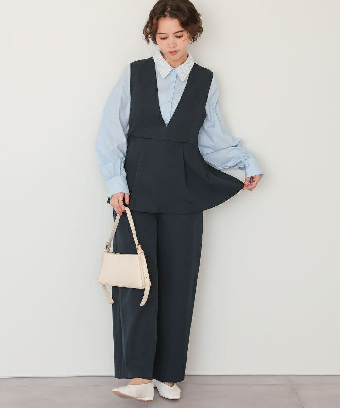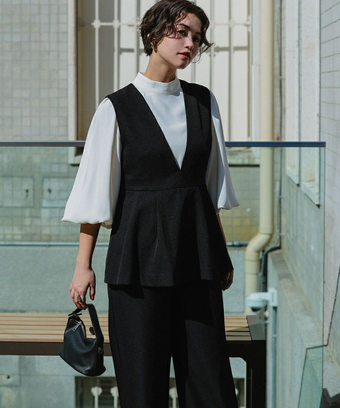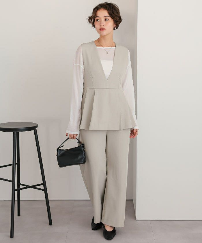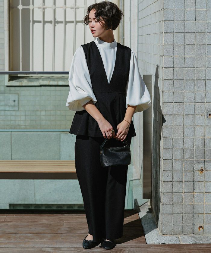 ・ペプラムトップスとパンツがドッキングがされたオールインワンなのでこれ1枚でセットアップコーデが叶う