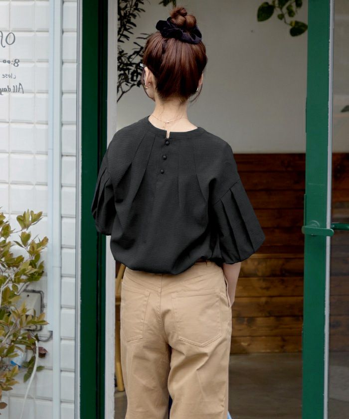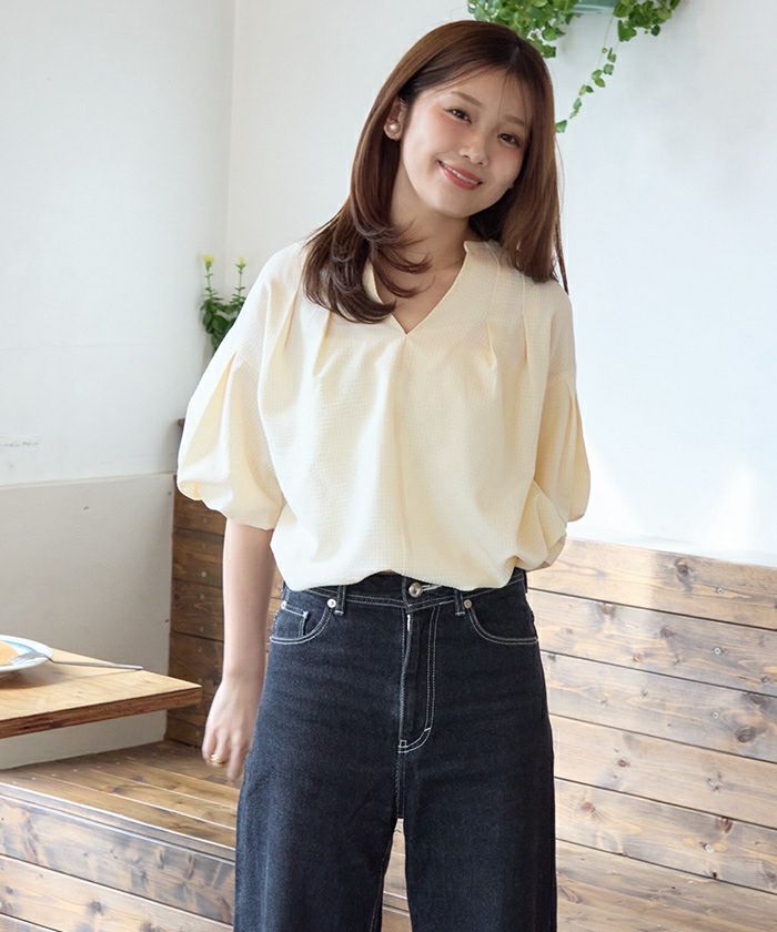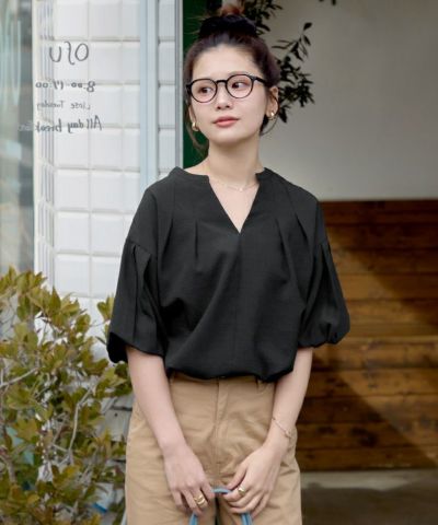 ・女性らしいボリューム袖がポイントの、スキッパーネックブラウス