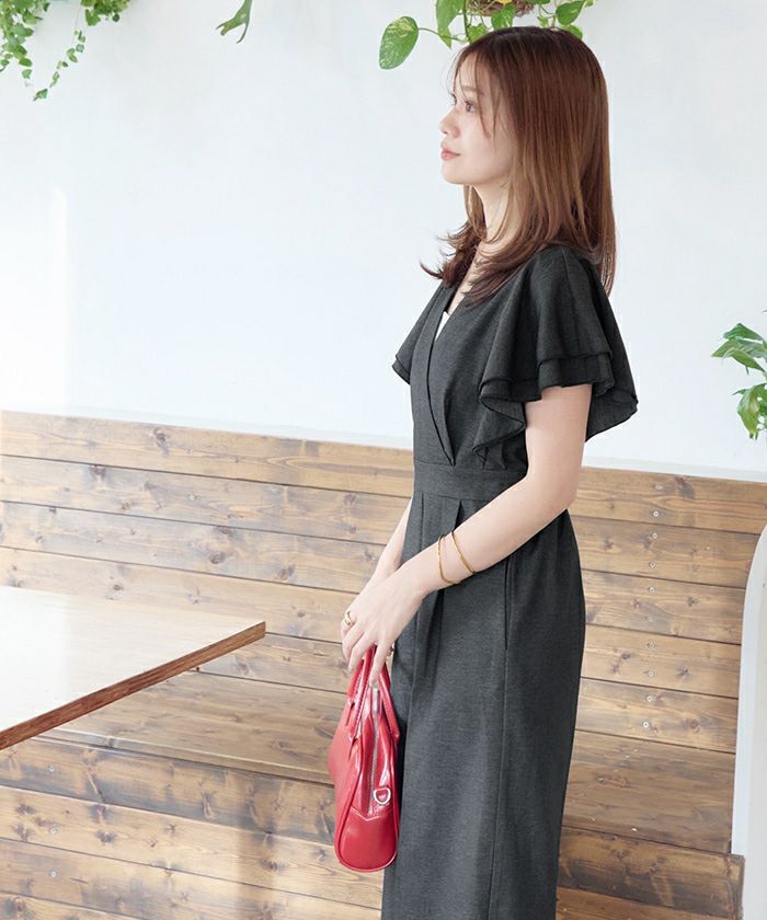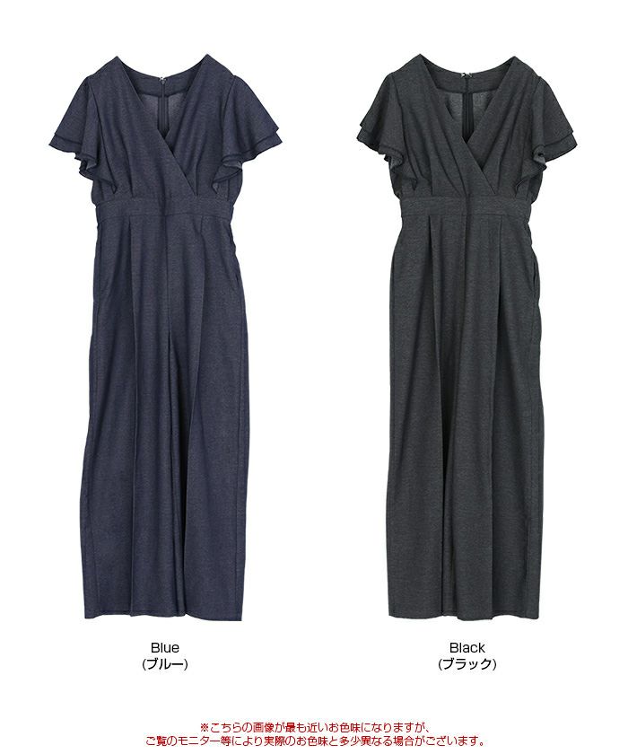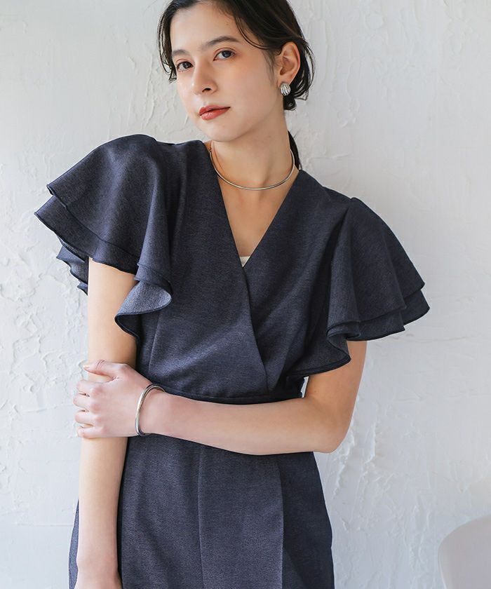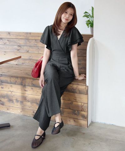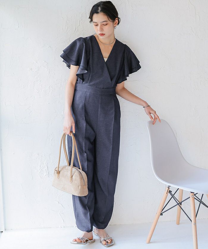 ・女性らしいカシュクールデザインが印象的な、上品なオールインワン