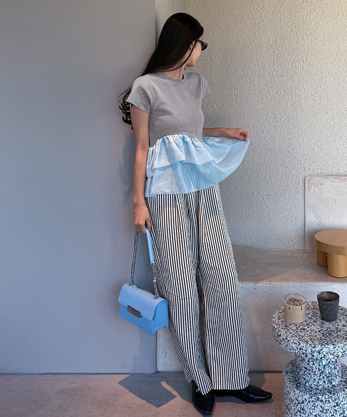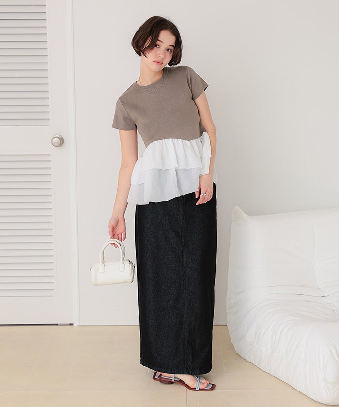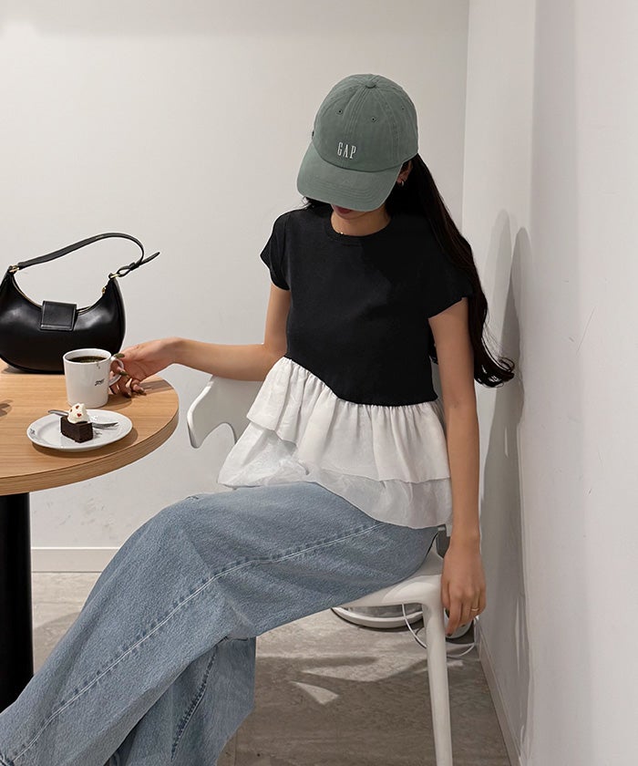 ・コンパクトな半袖ニットに、シアー素材のフリルをドッキングしたデザイントップス