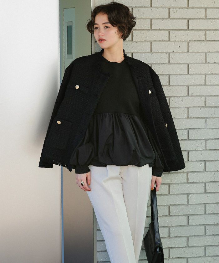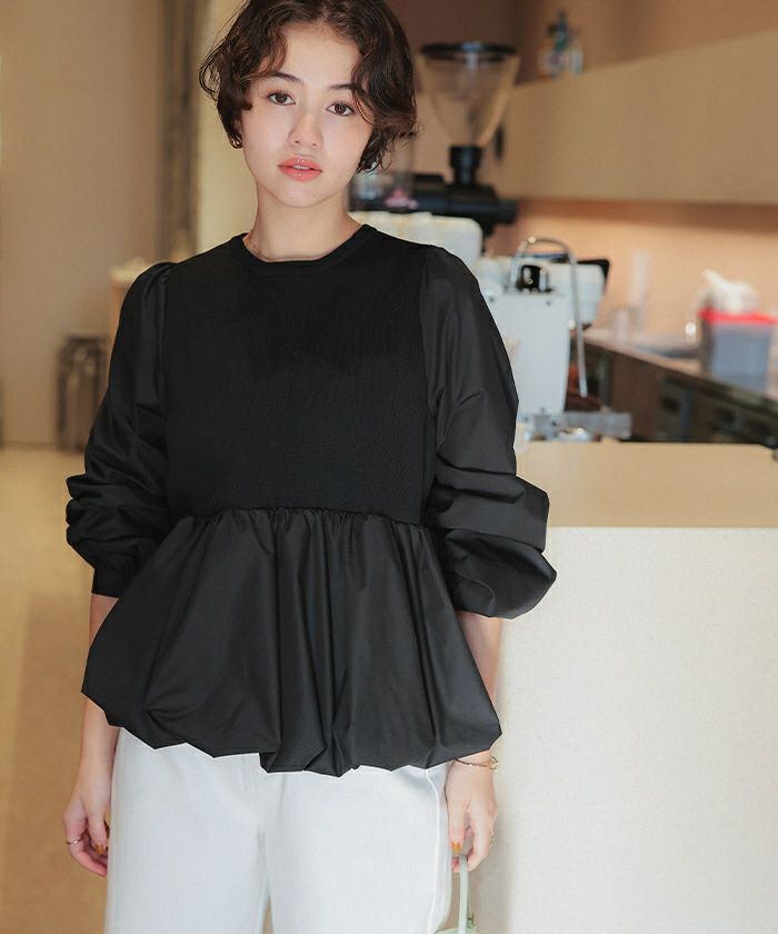 ・異素材ドッキングで表情豊かに仕上げた、大人フェミニンなペプラムトップス