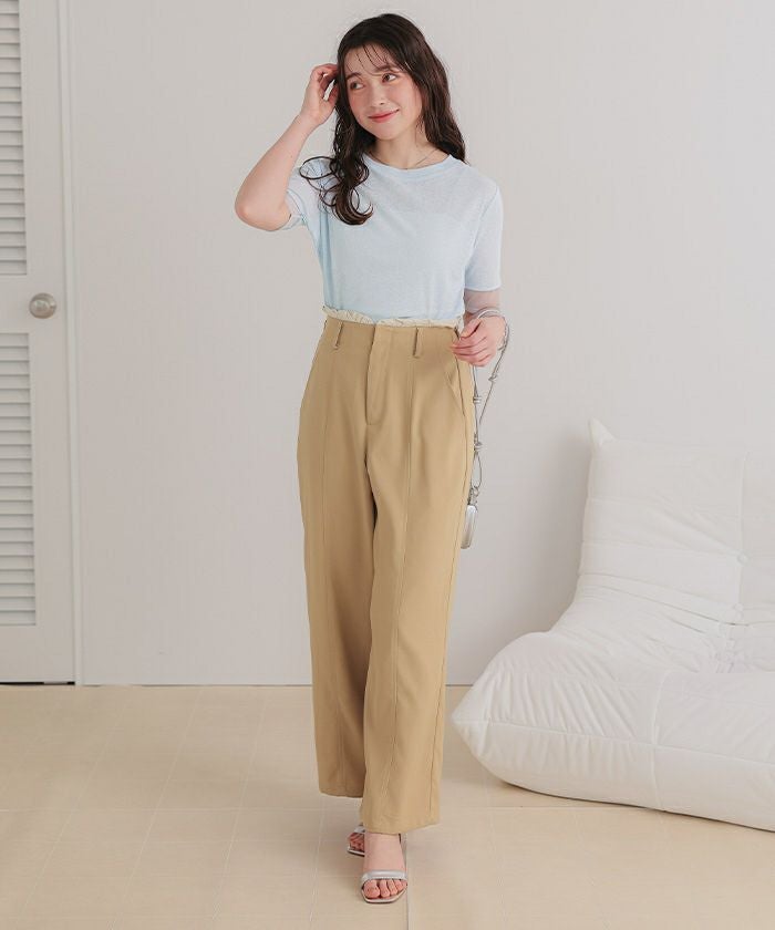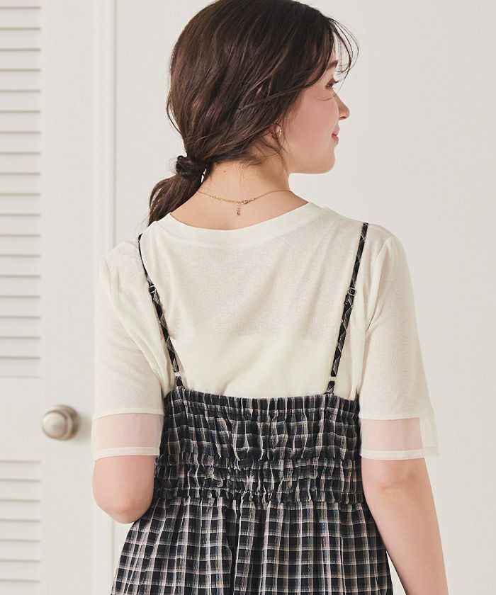 ・本体素材もほんのり透け感のあるカットソー素材で、抜け感を演出。甘さがありつつもデイリーに着やすい快適な着心地