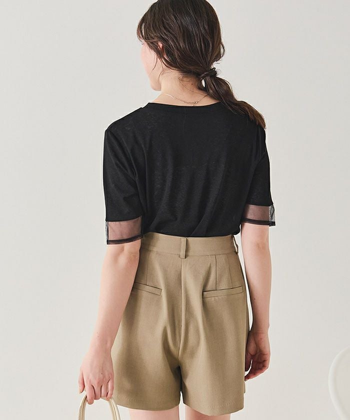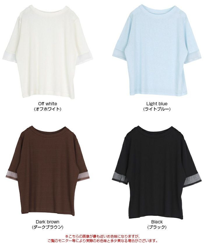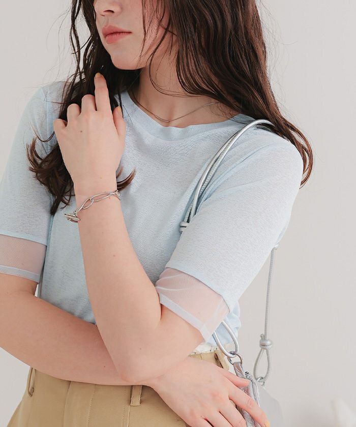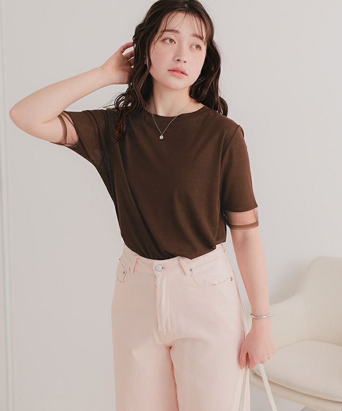 ・袖口のシアー切替がポイント。さりげない肌見せで女性らしさが高まるカットソートップス
