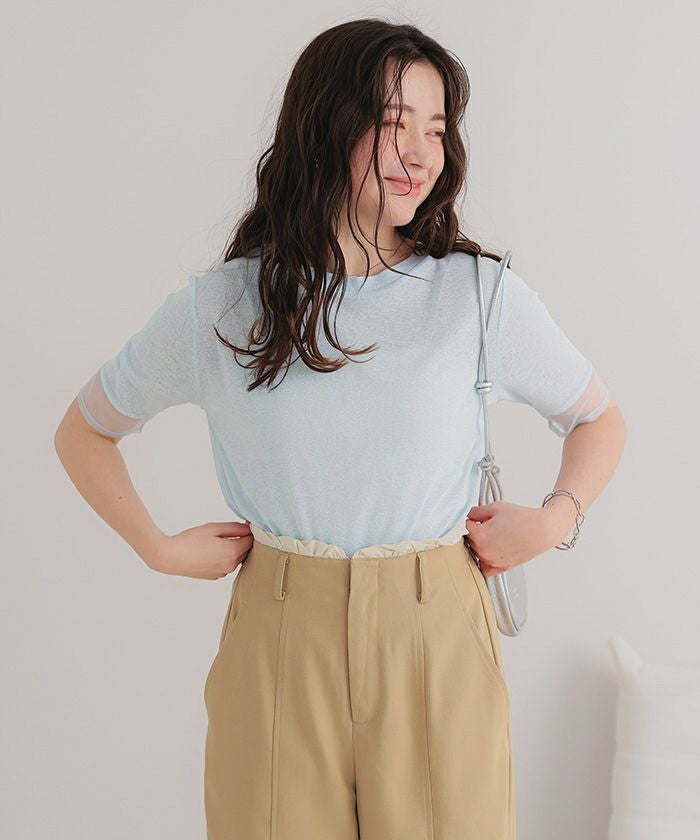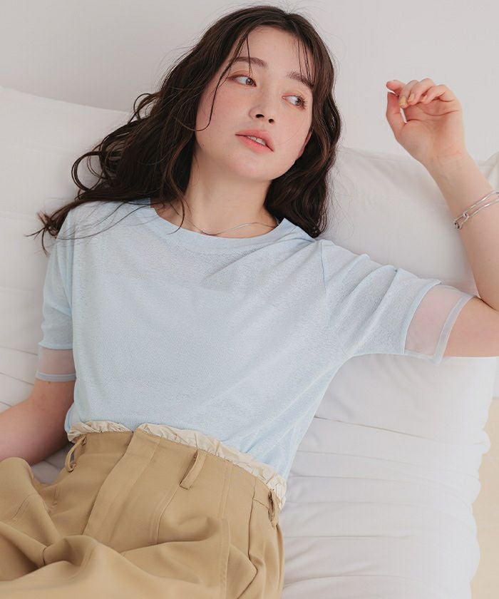 ・ハーフスリーブ×シアーのバランスで、二の腕をやさしくカバーしながら軽やかな印象に