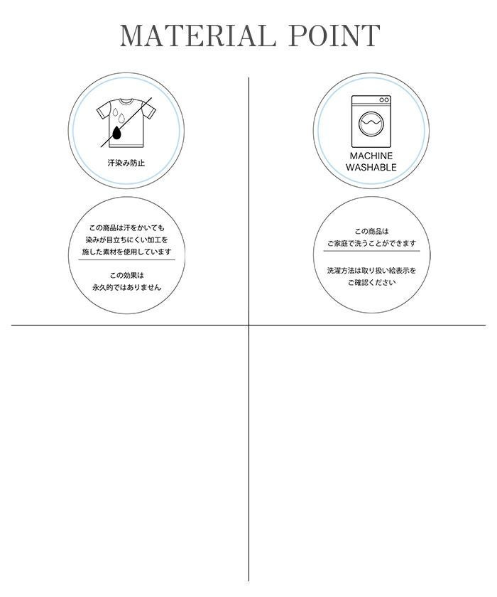 素材の特性上、汗染み防止加工は洗濯を繰り返すことや長期使用により、徐々に効果は低下いたします。予めご了承下さい。