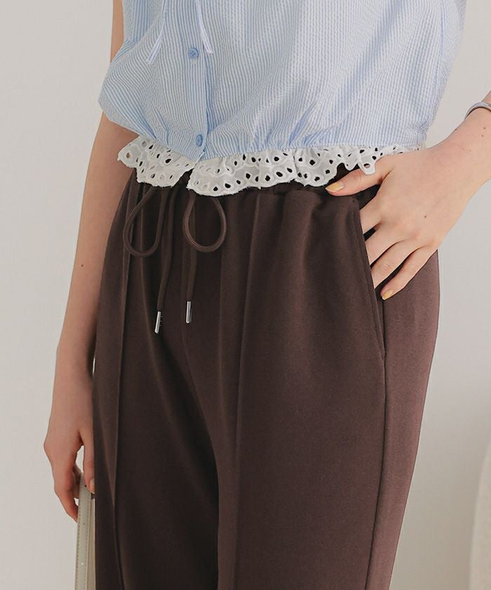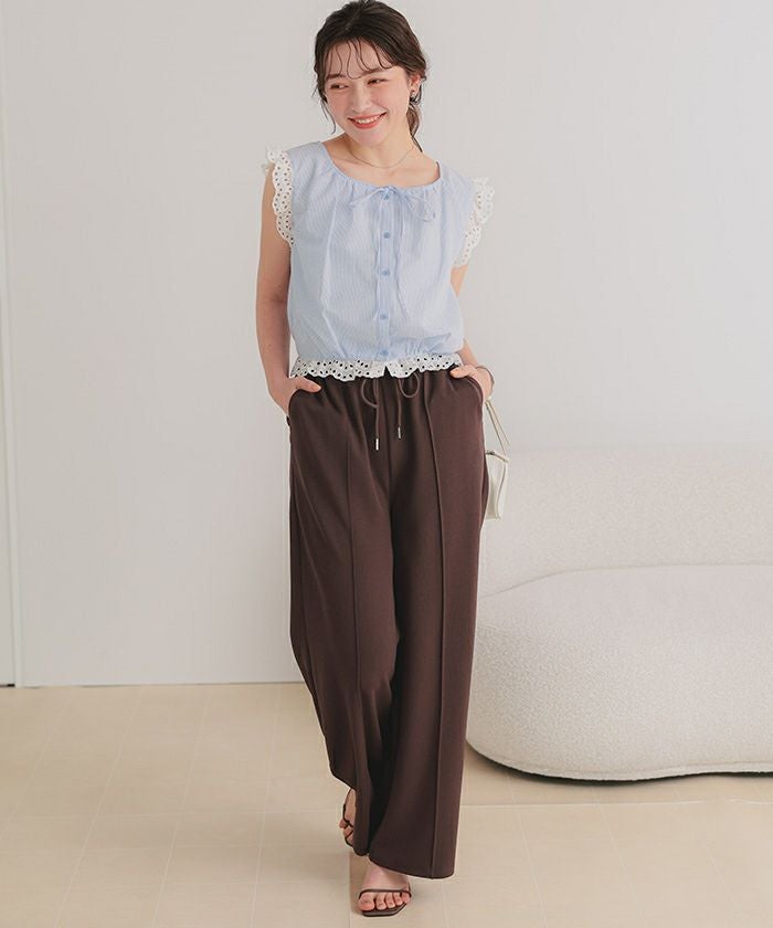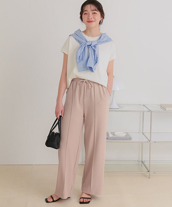 ・ウエストは総ゴム仕様に加え、ドローストリング付きでサイズ調整がしやすく、ストレスフリーな着用感
