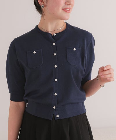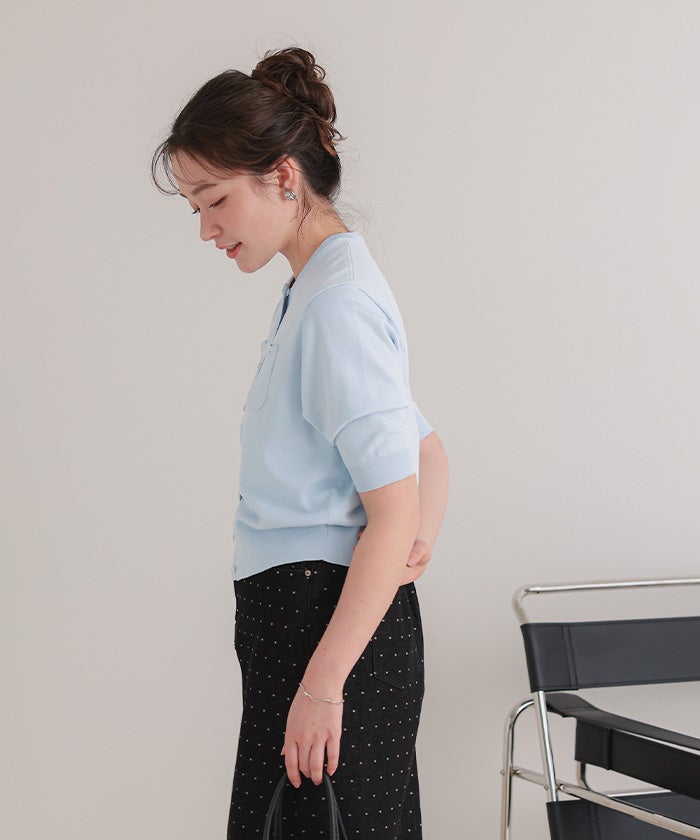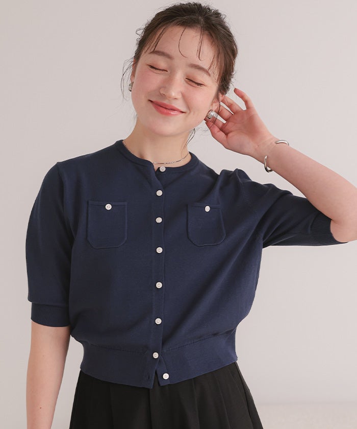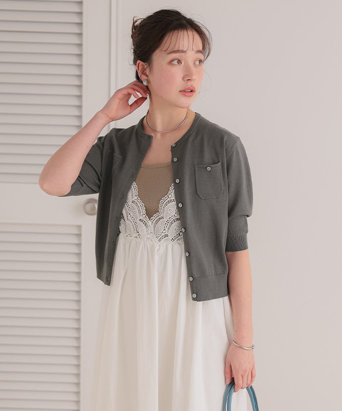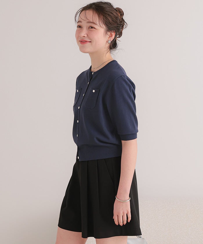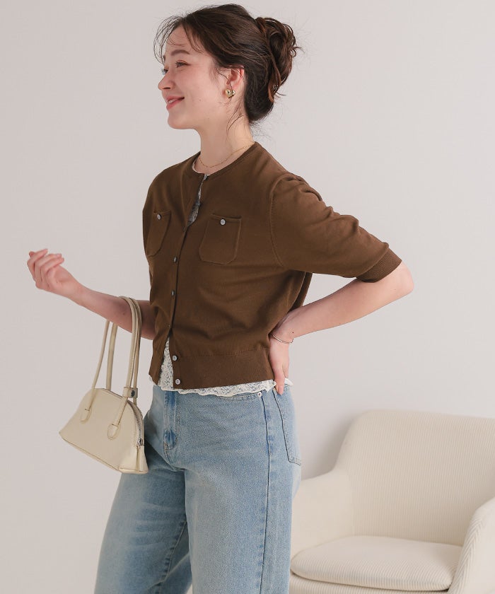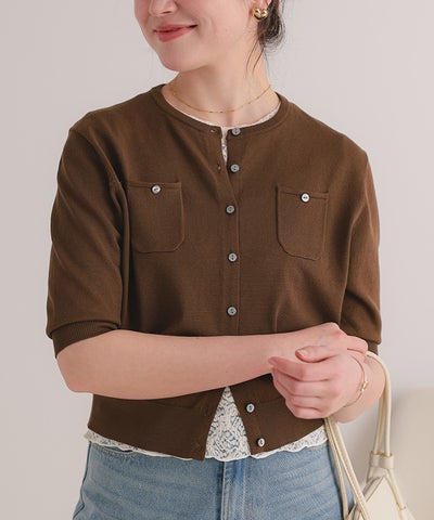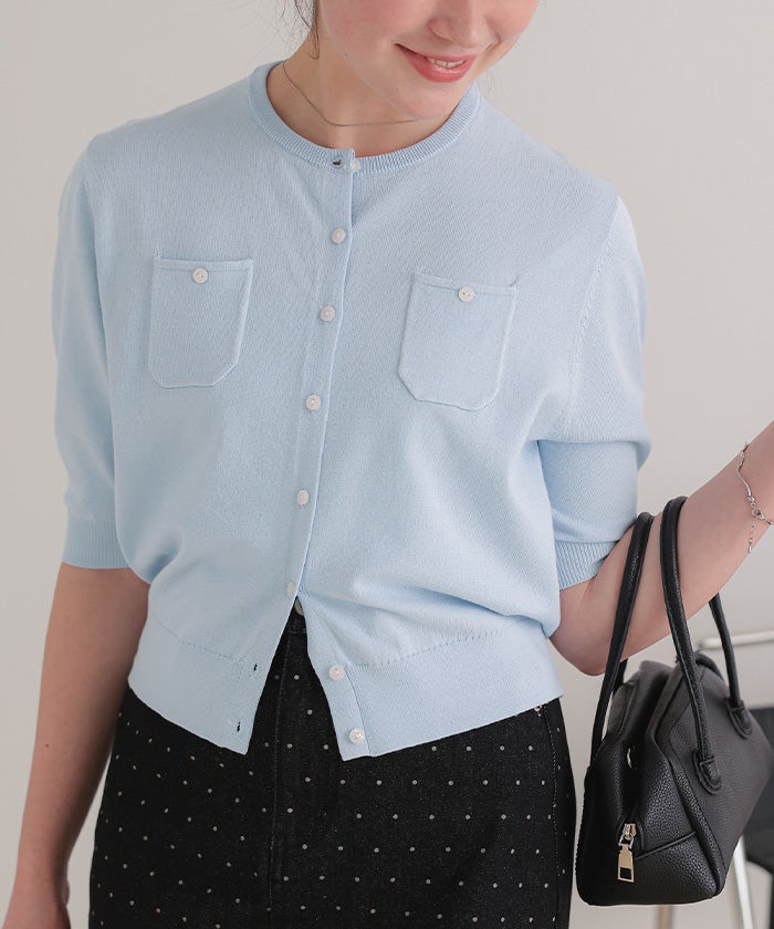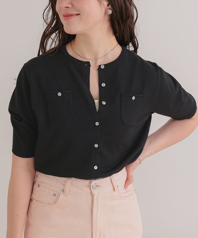 UVケア/抗ピル胸ポケットハーフスリーブニットカーディガン【メール便可/100】